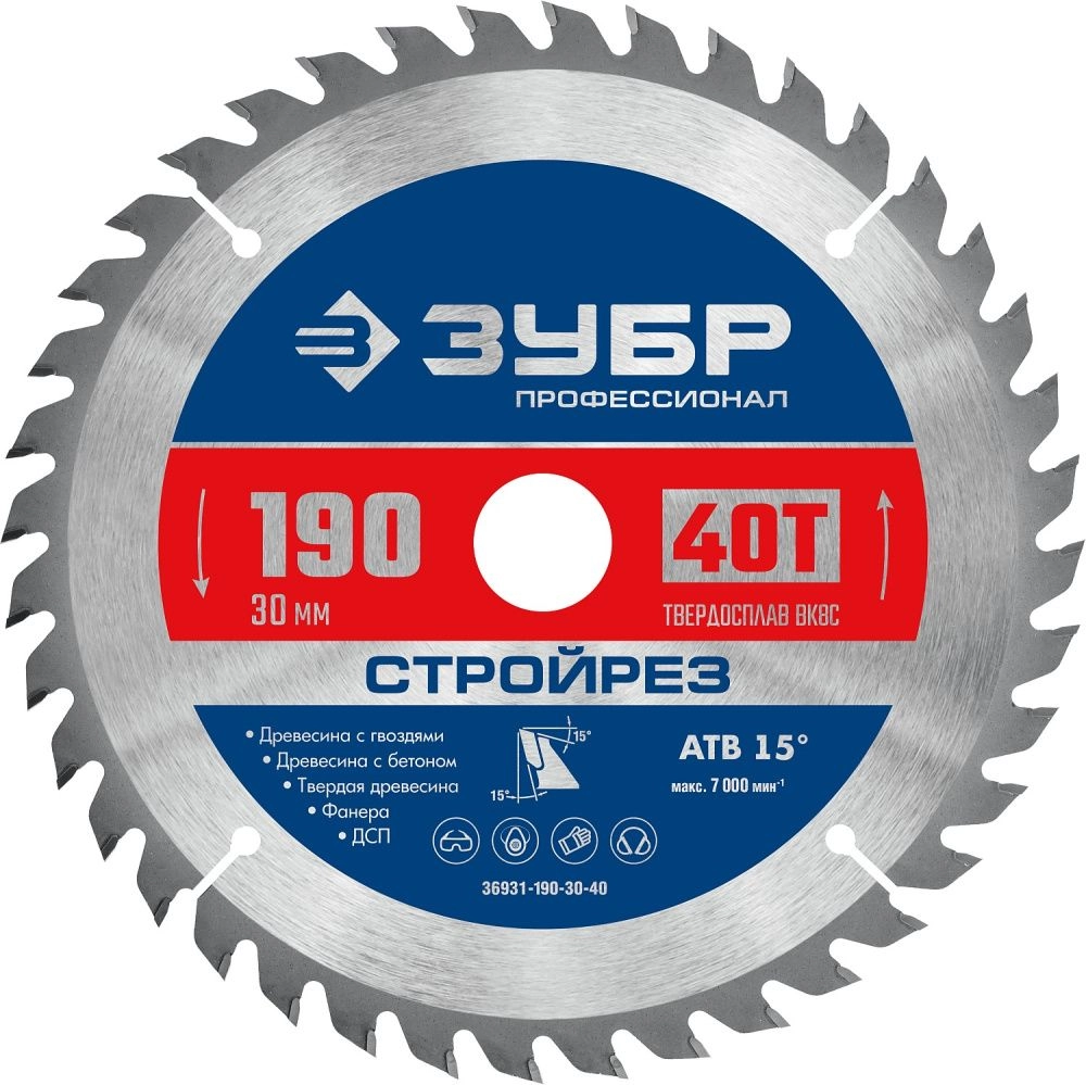 ПроизводителиДиск пильный 190х30х40Т по строительной древесине "Стройрез" (36931-190-30-40) ЗУБР