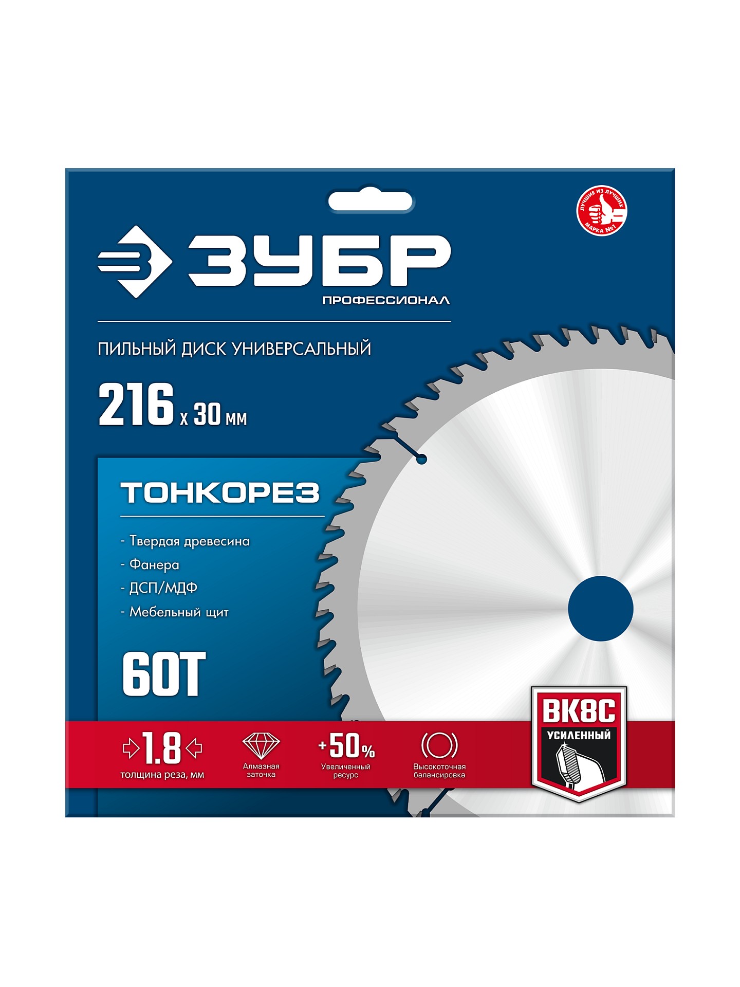 ПроизводителиДиск пильный 216х30x1.8х60Т по дереву "Тонкорез" (36933-216-30-60) ЗУБР