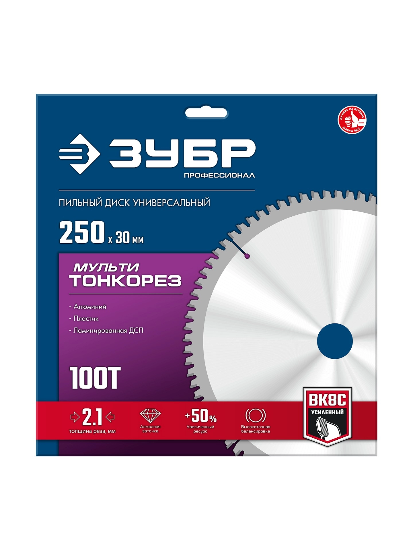 ПроизводителиДиск пильный 250х30x2.1х100Т по алюм., дереву, ламин. ДСП "Мульти Тонкорез" (36934-250-30-100) ЗУБР