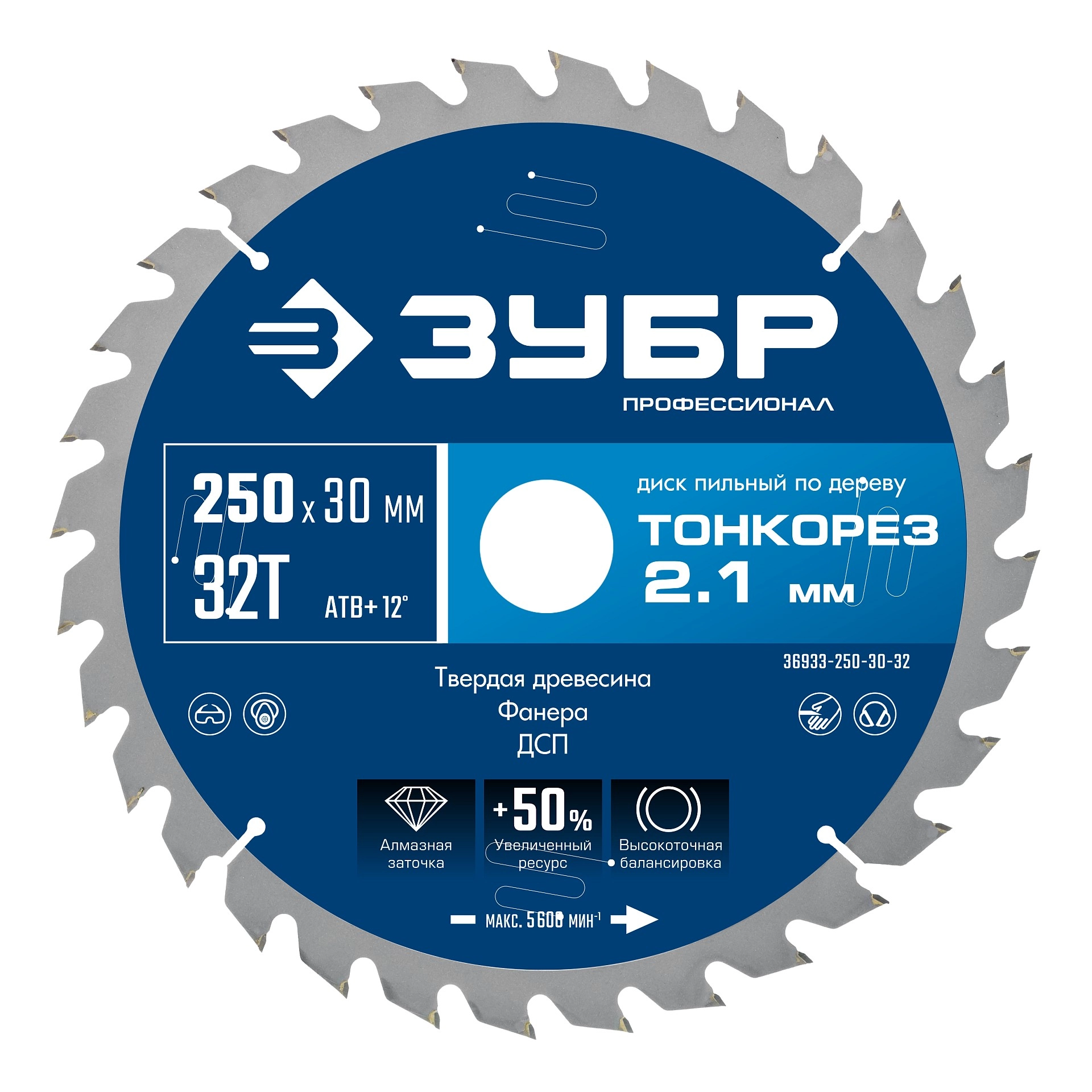 ПроизводителиДиск пильный 250х30x2.1х32Т по дереву "Тонкорез" (36933-250-30-32) ЗУБР