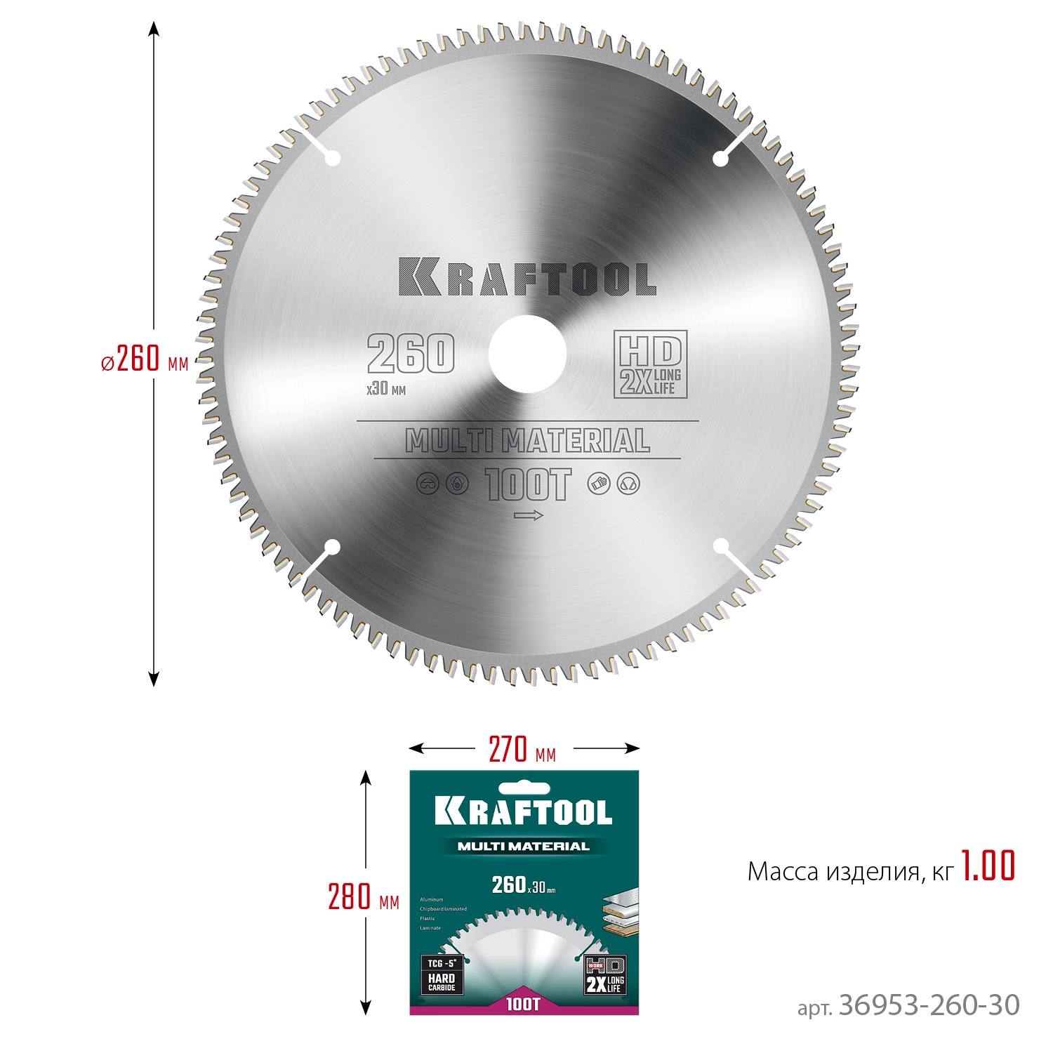 ПроизводителиДиск пильный 260х30х100Т по алюминию "Multi Material" (36953-260-30) KRAFTOOL