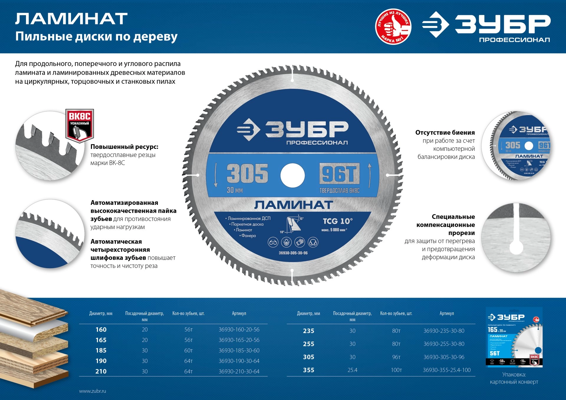 ПроизводителиДиск пильный 305х30х2.7х96Т по ламинату "Ламинат" (36930-305-30-96) ЗУБР