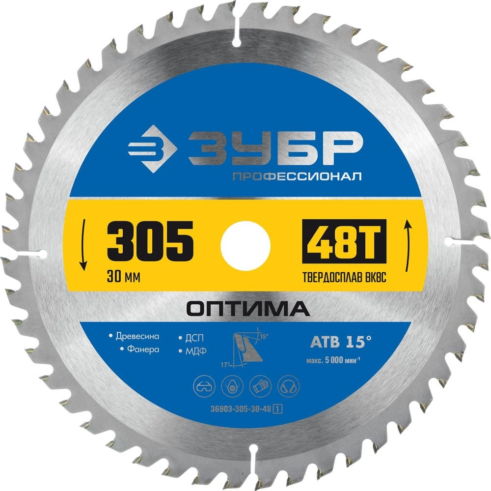 ХарактеристикиАртикул 36903-305-30-48_z01Бренды ЗубрСтрана производства КитайКоличество зубьев 48Диаметр, мм 305Посадочный диаметр 30Толщина круга 2Тип геометрии зубьев АТВМатериал зубьев твердый сплав ВК 8Ширина реза, мм 2.8Оптима - универсальный пильный диск, для быстрого распила всех типов древесины. Применяется для распила твердых и мягких пород дерева, клеевых плит, древесно-стружечных плит и МДФ( в том числе облицованных натуральным шпоном, меланиновой пленкой. бумагой. пластиком и др.)фанеры и облицованной фанерыПроизводитель: Крафтул И/Е Гмбх, Альтер Поствег Штр., Лоенинген, Германия