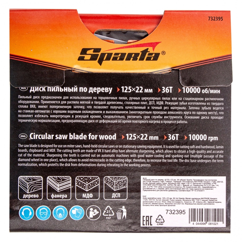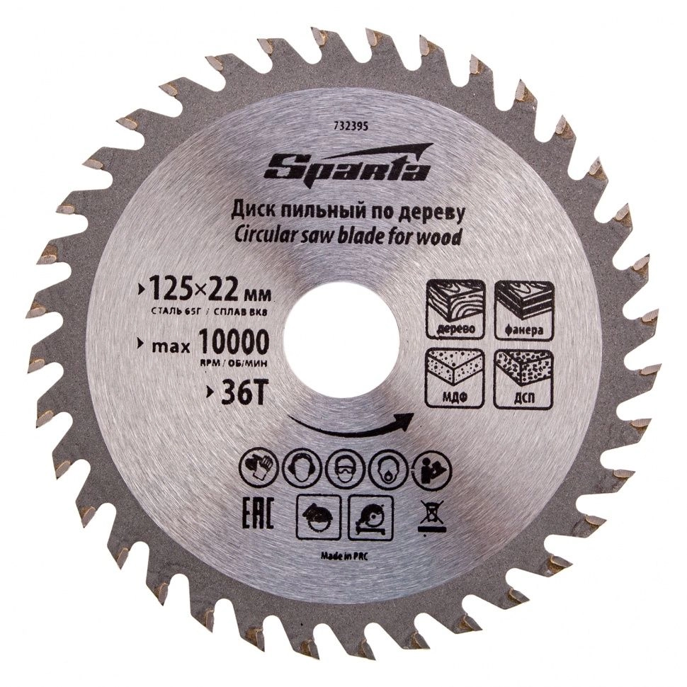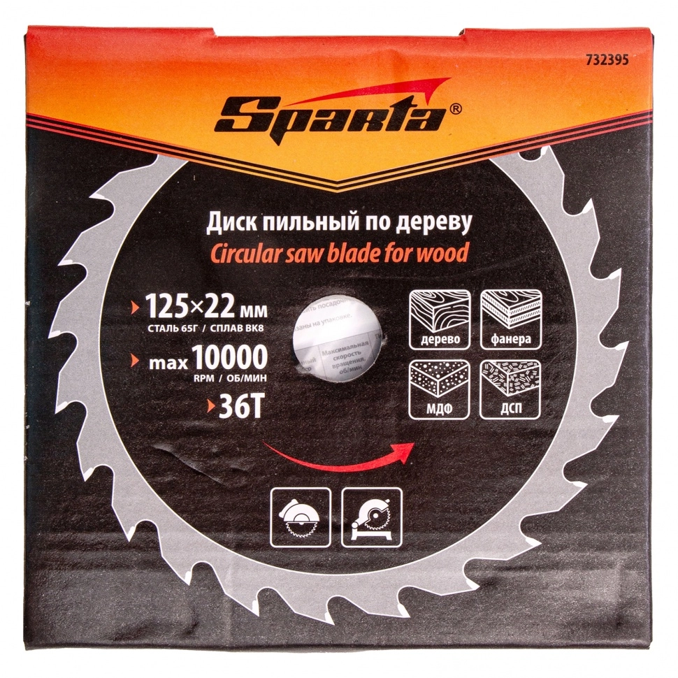 ХарактеристикиАртикул 732395Бренды SPARTAСтрана производства КитайКоличество зубьев 36Диаметр, мм 125Посадочный диаметр 22,23Пильный диск Sparta 732395, ф125 х 22 мм, с 36 зубьями используется для распила древесины мягких и твердых пород, фанеры, плит ДСП и МДФ.