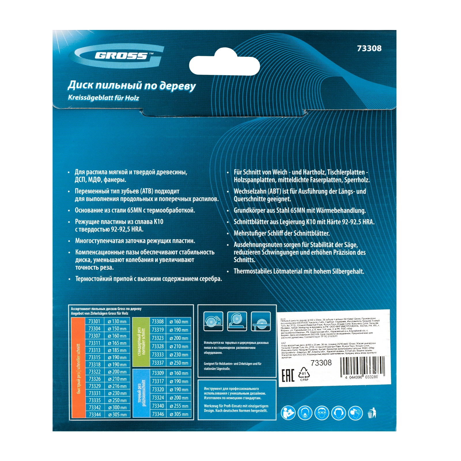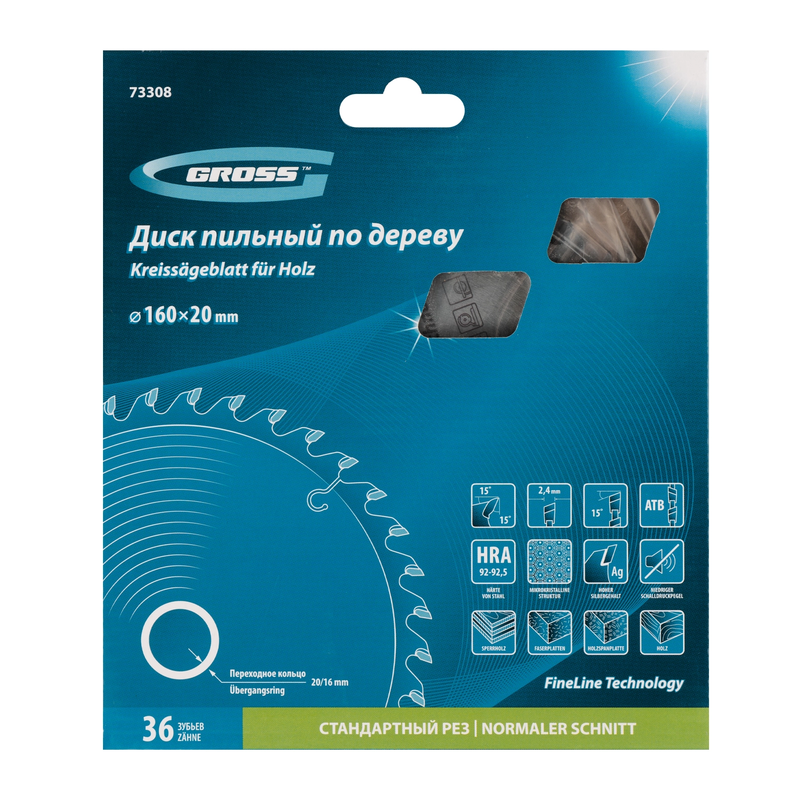 Является оснасткой для циркулярных и торцовочных пил с посадочным диаметром 20 мм, благодаря универсальному типу зубьев АТВ подходит как для продольного, так и для поперечного реза материалов.