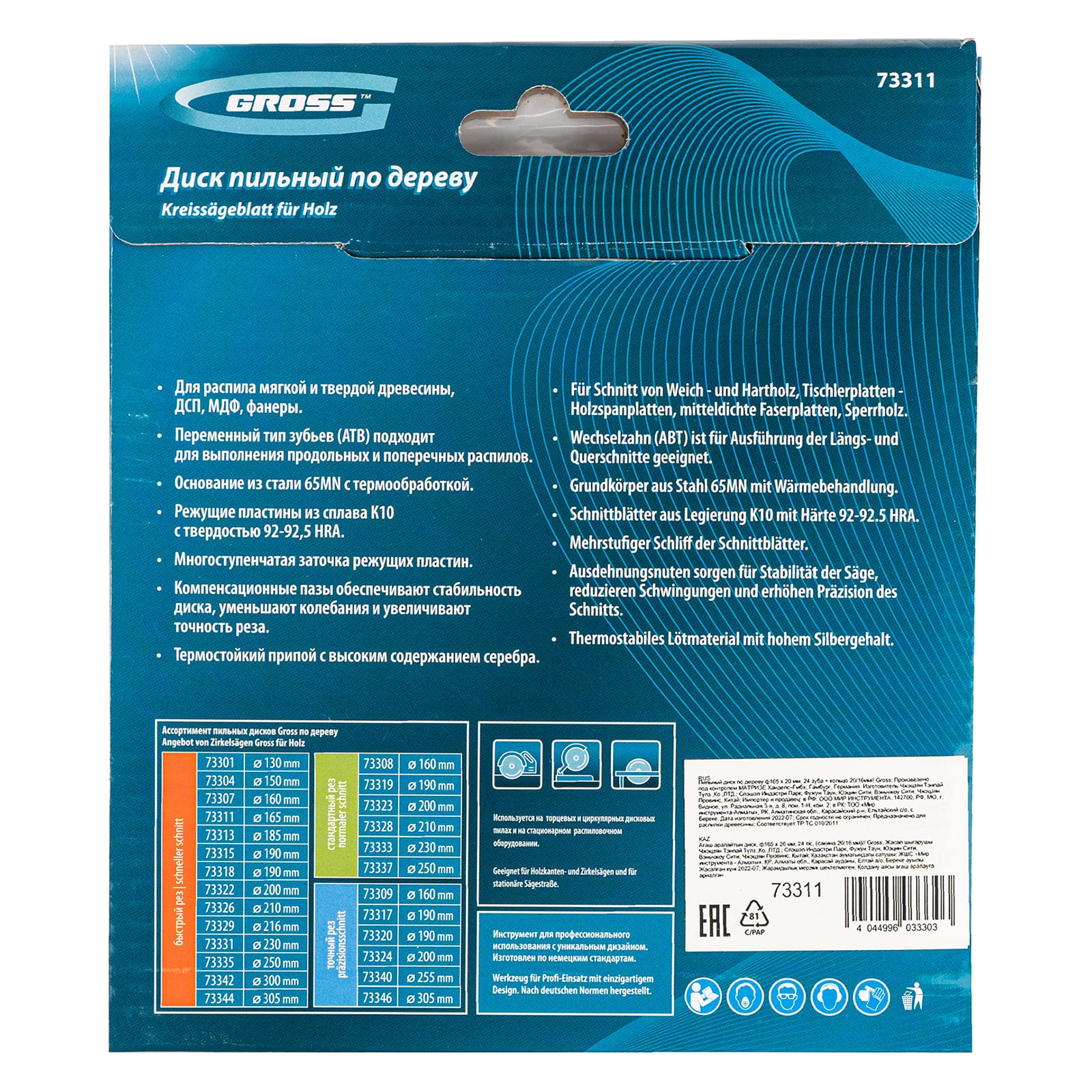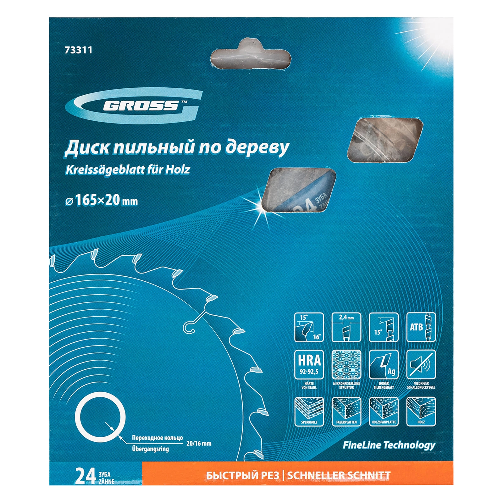 Является оснасткой для циркулярных и торцовочных пил с посадочным диаметром 20 мм, благодаря универсальному типу зубьев АТВ подходит как для продольного, так и для поперечного реза материалов.