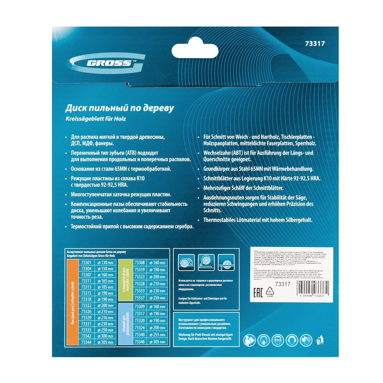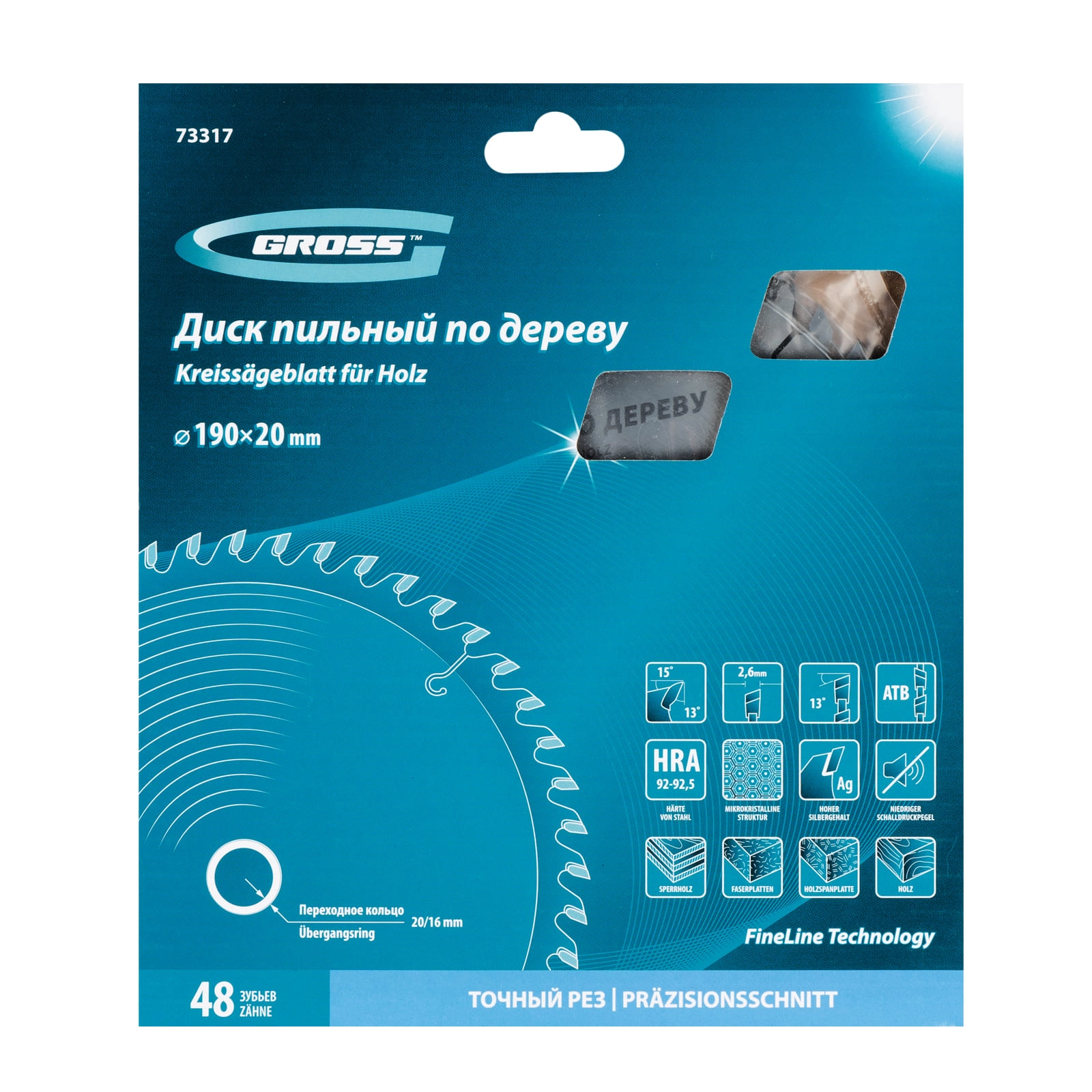 Является оснасткой для циркулярных и торцовочных пил с посадочным диаметром 20 мм, благодаря универсальному типу зубьев АТВ подходит как для продольного, так и для поперечного реза материалов.