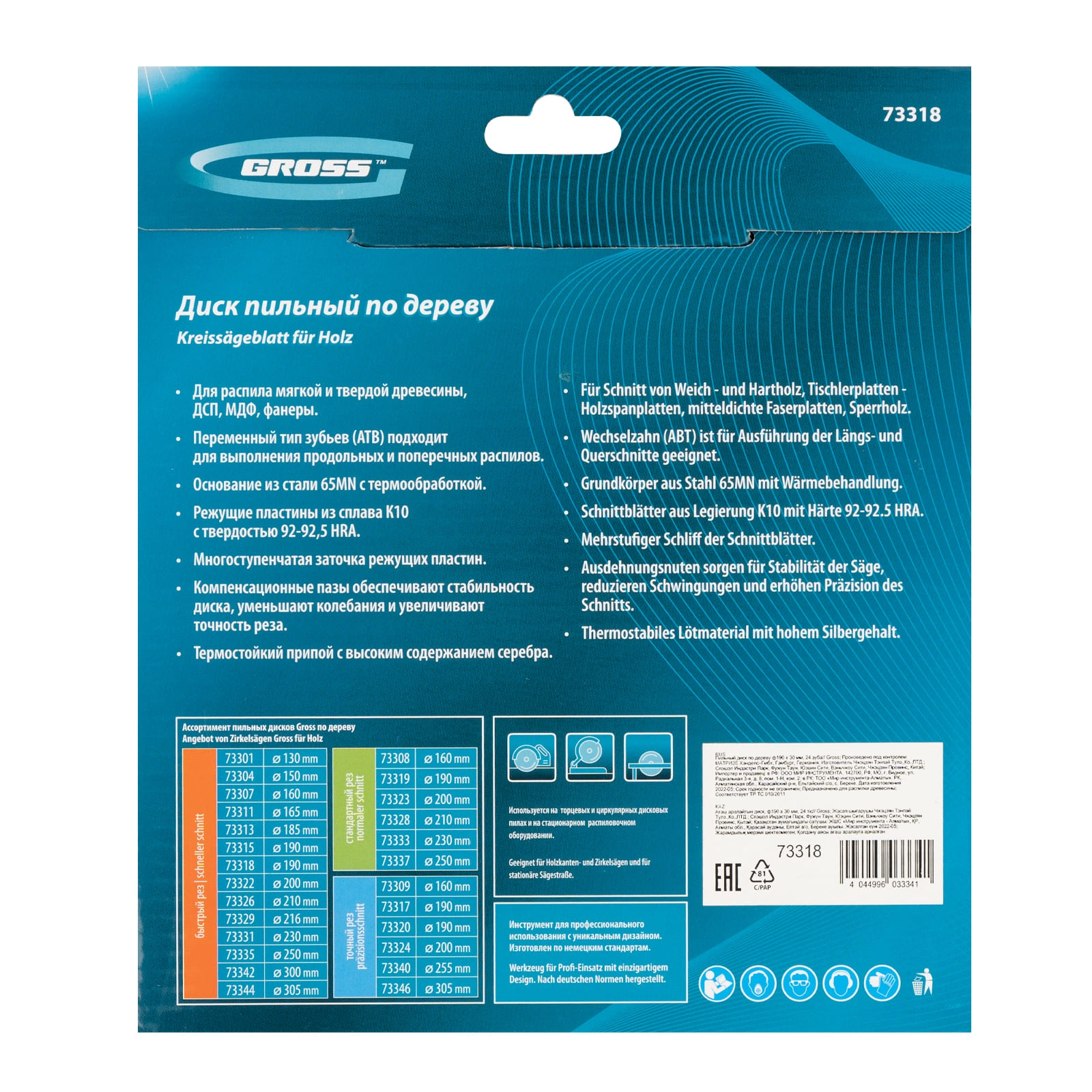 Является оснасткой для циркулярных и торцовочных пил с посадочным диаметром 30 мм, благодаря универсальному типу зубьев АТВ подходит как для продольного, так и для поперечного реза материалов.