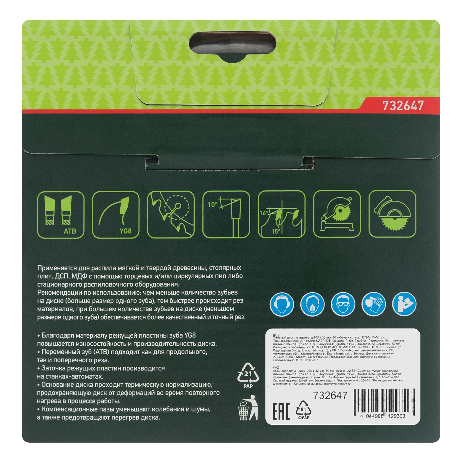 60 зубьев типа АТВ позволяют использовать диск для качественного и точного поперечного распила материалов и получения чистых кромок.