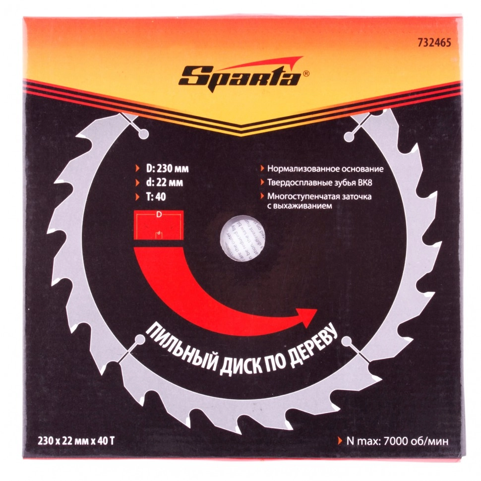ХарактеристикиАртикул 732465Бренды SPARTAСтрана производства КитайКоличество зубьев 40Диаметр, мм 230Посадочный диаметр 22,23Пильный диск Sparta 732465, ф230 х 22 мм, с 40 зубьями используется для распила древесины мягких и твердых пород, фанеры, плит ДСП и МДФ.