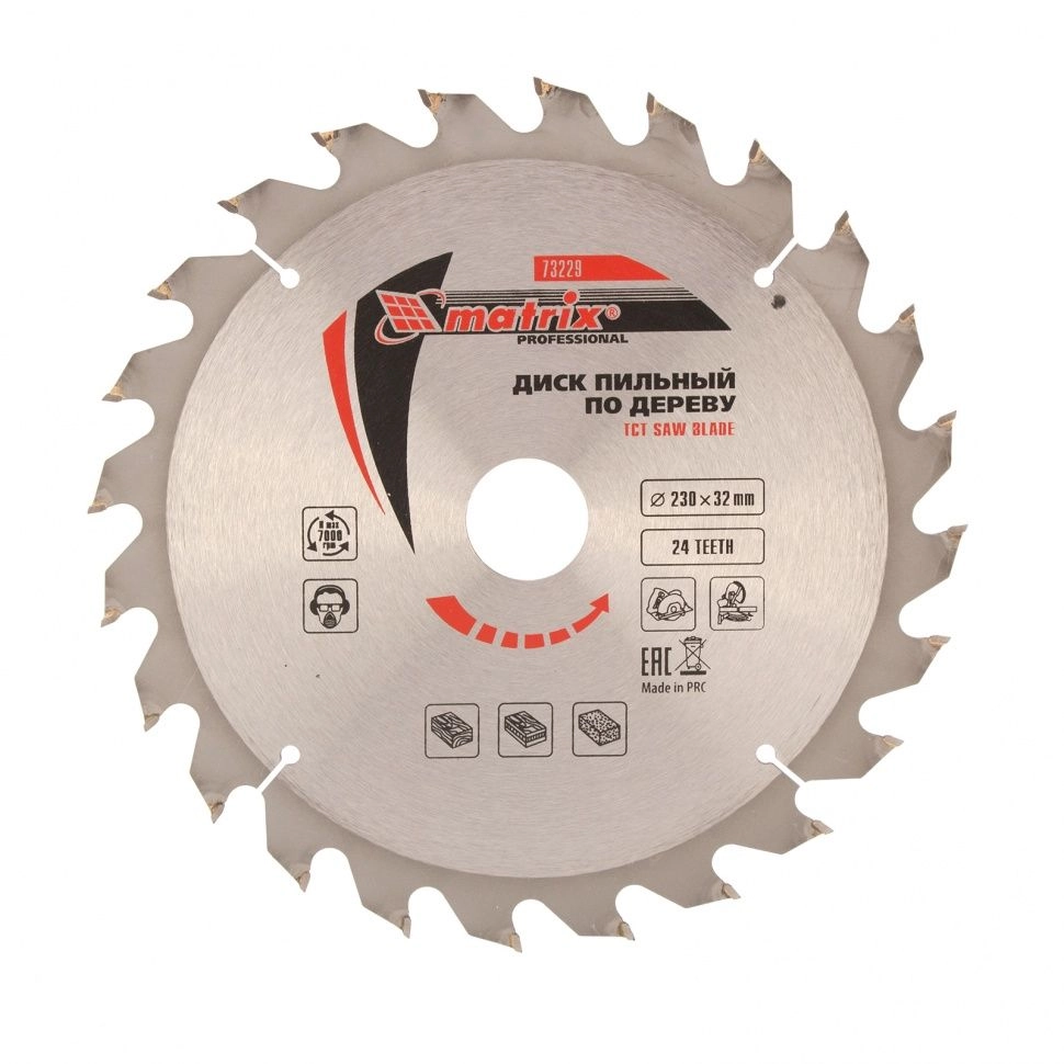 ПроизводителиДиск пильный 230х30/32х24T по дереву (73229) MATRIX
