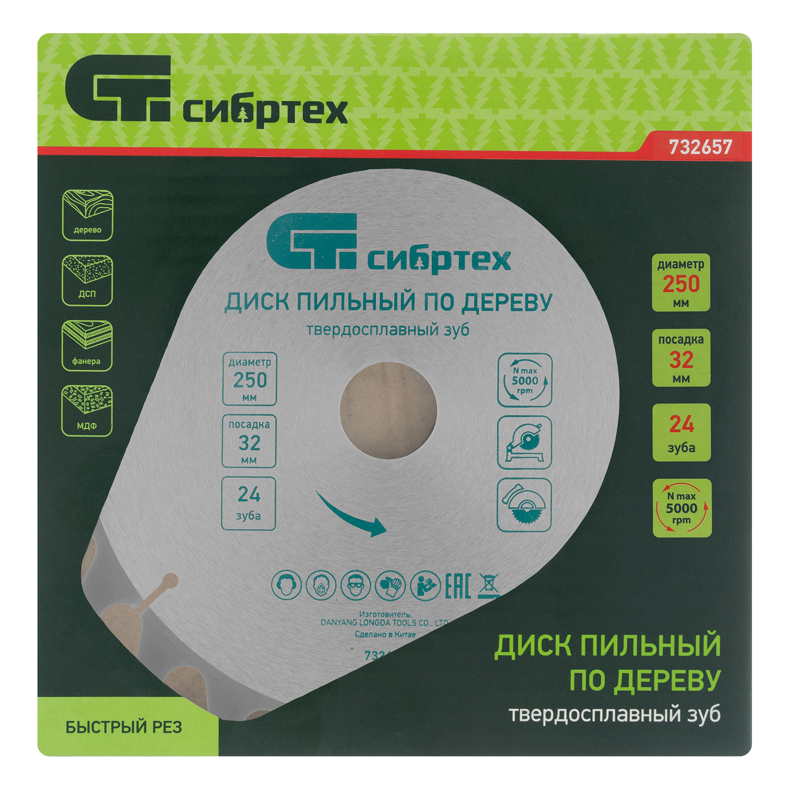 ПроизводителиДиск пильный 250х32х24T по дереву (732657) СИБРТЕХ