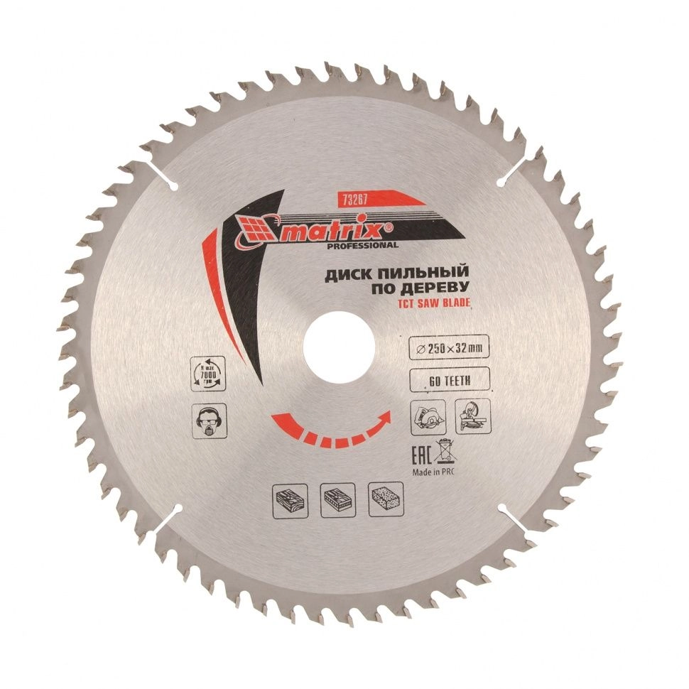 ПроизводителиДиск пильный 250х32х60T по дереву (73267) MATRIX