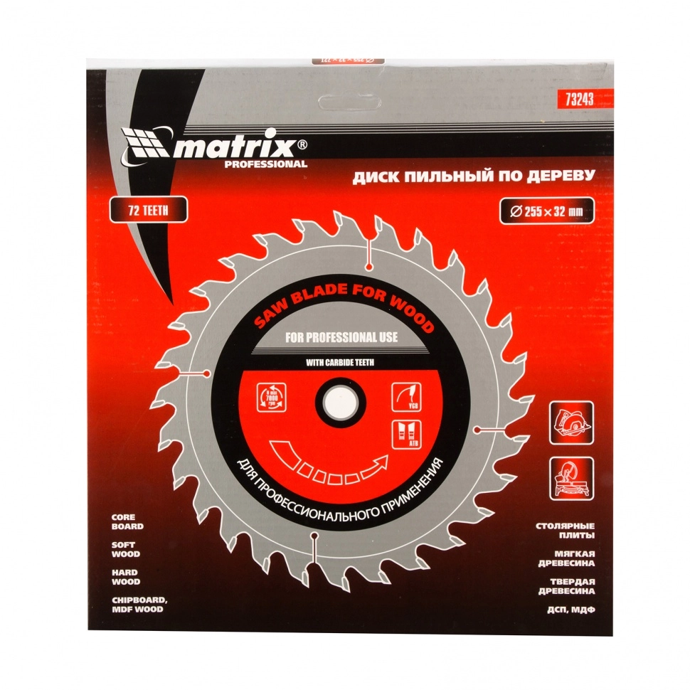 ПроизводителиДиск пильный 255х30/32х72T по дереву (73243) MATRIX