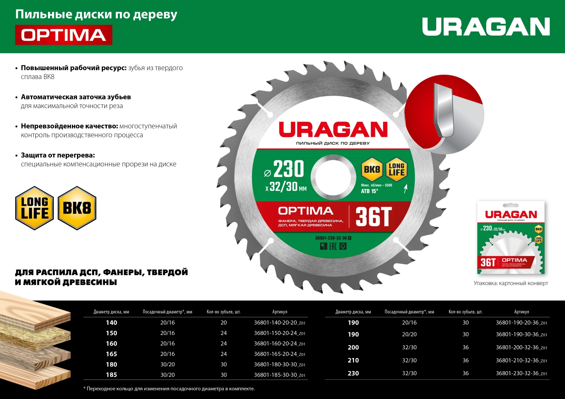 ПроизводителиДиск по дереву пильный 24Т, 165х20/16мм, Optima (36801-165-20-24_z01) URAGAN