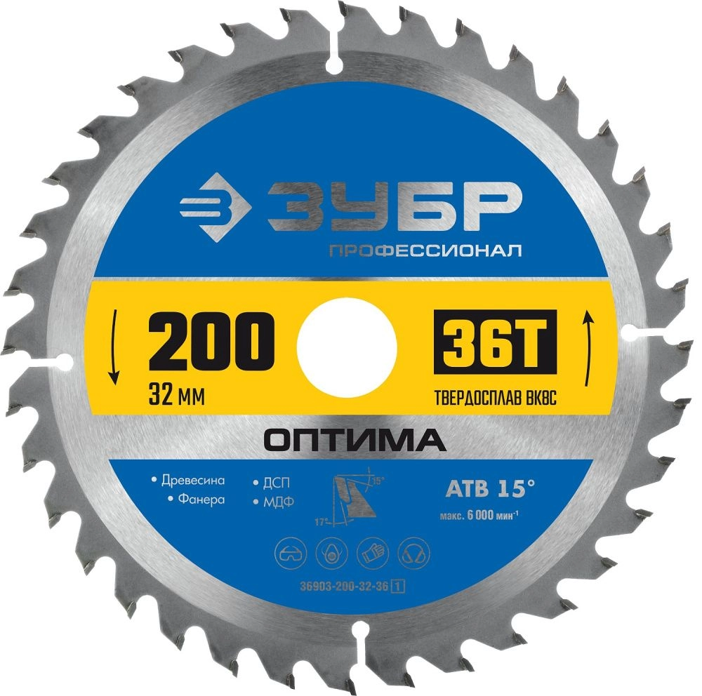 ПроизводителиДиск по дереву пильный 36Т, 200х32мм, Оптима, Профессионал (36903-200-32-36_z01) ЗУБР