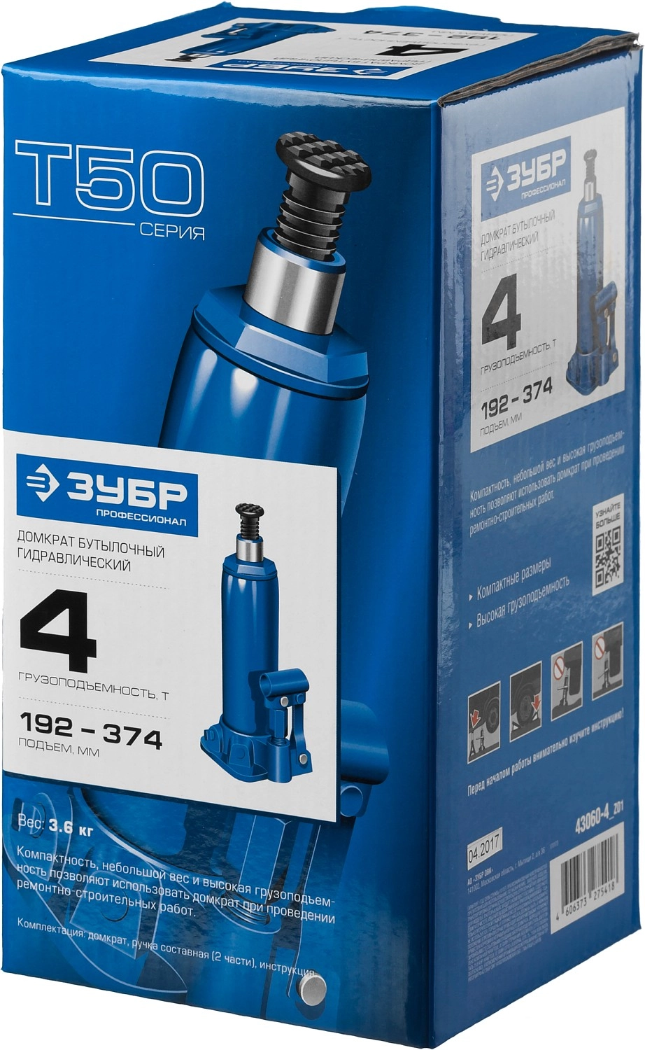 ПроизводителиДомкрат гидравлический бутылочный, 4т., 192-374 мм "ПРОФЕССИОНАЛ" (43060-4_z01) ЗУБР