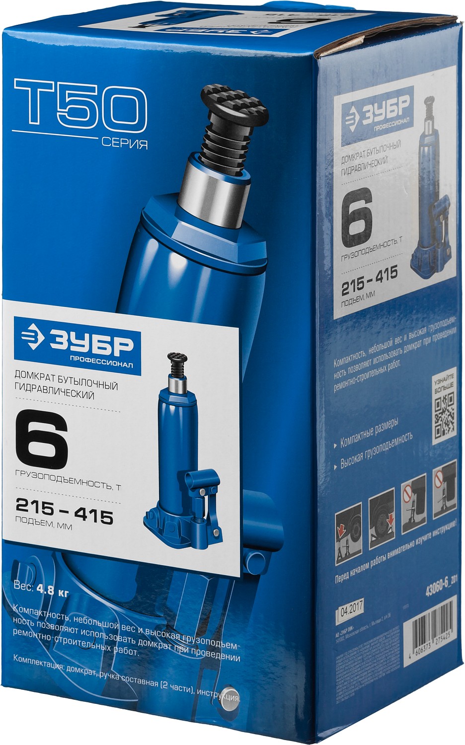ПроизводителиДомкрат гидравлический бутылочный, 6т., 215-415 мм "ПРОФЕССИОНАЛ" (43060-6_z01) ЗУБР