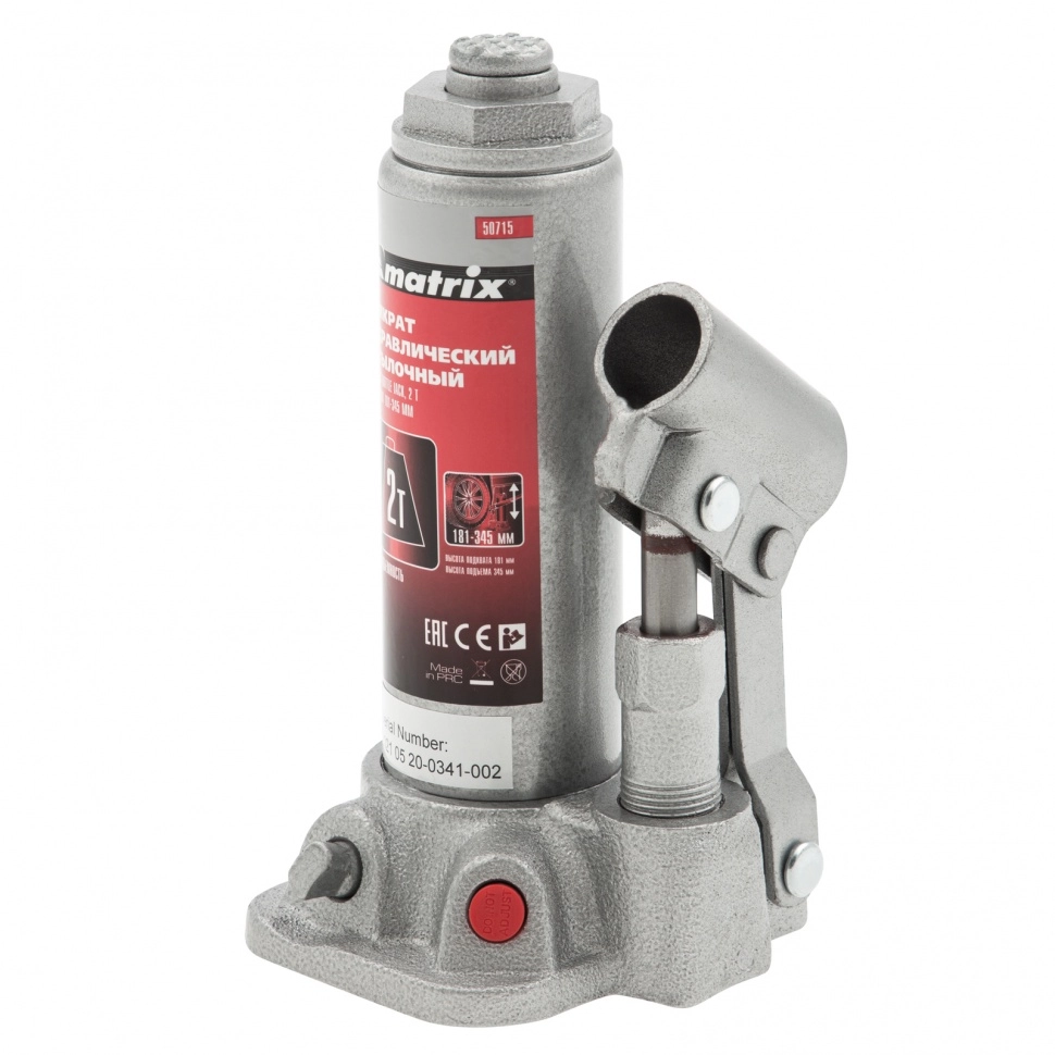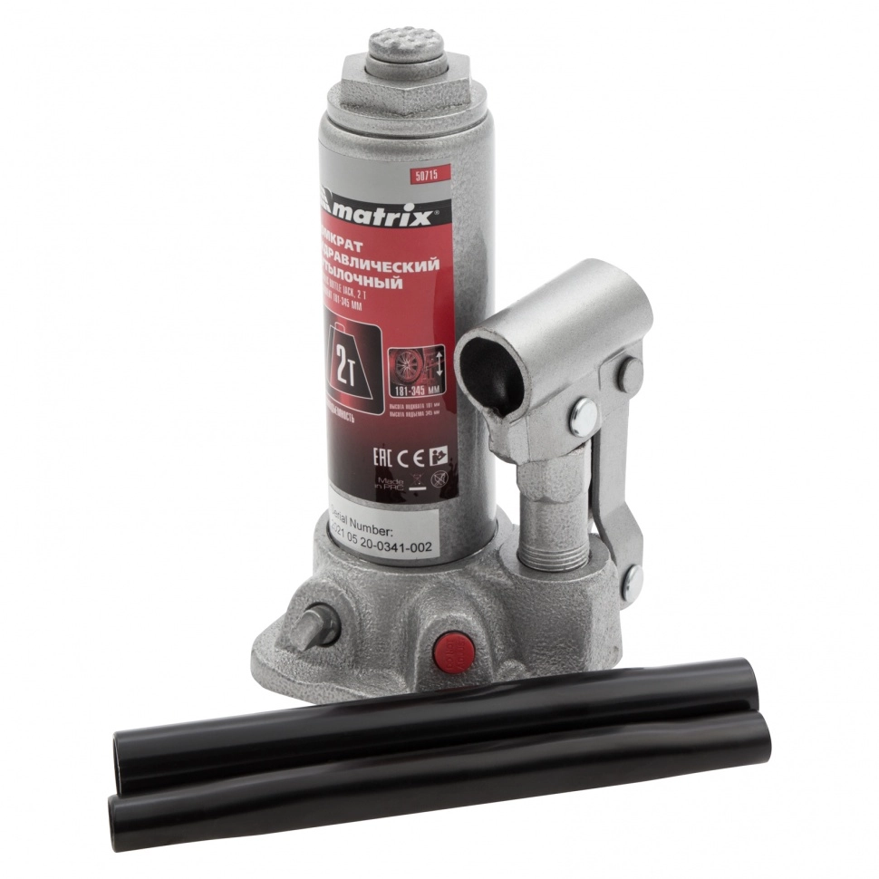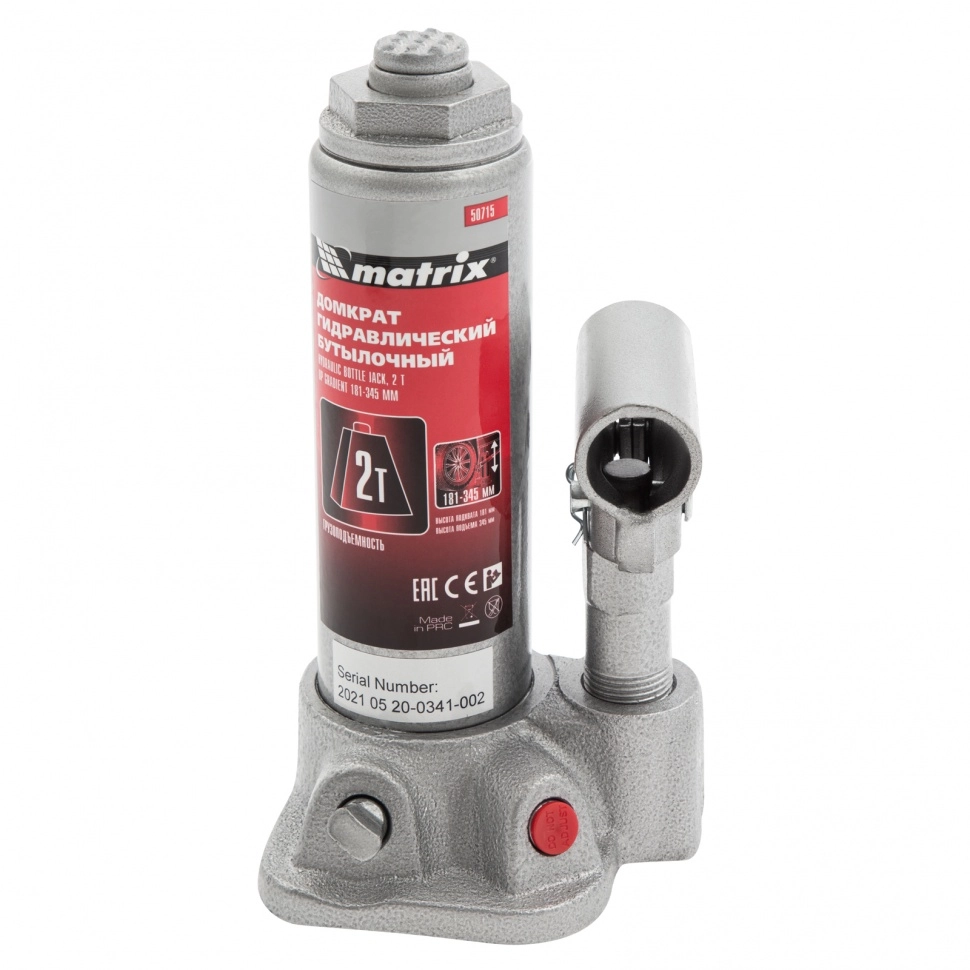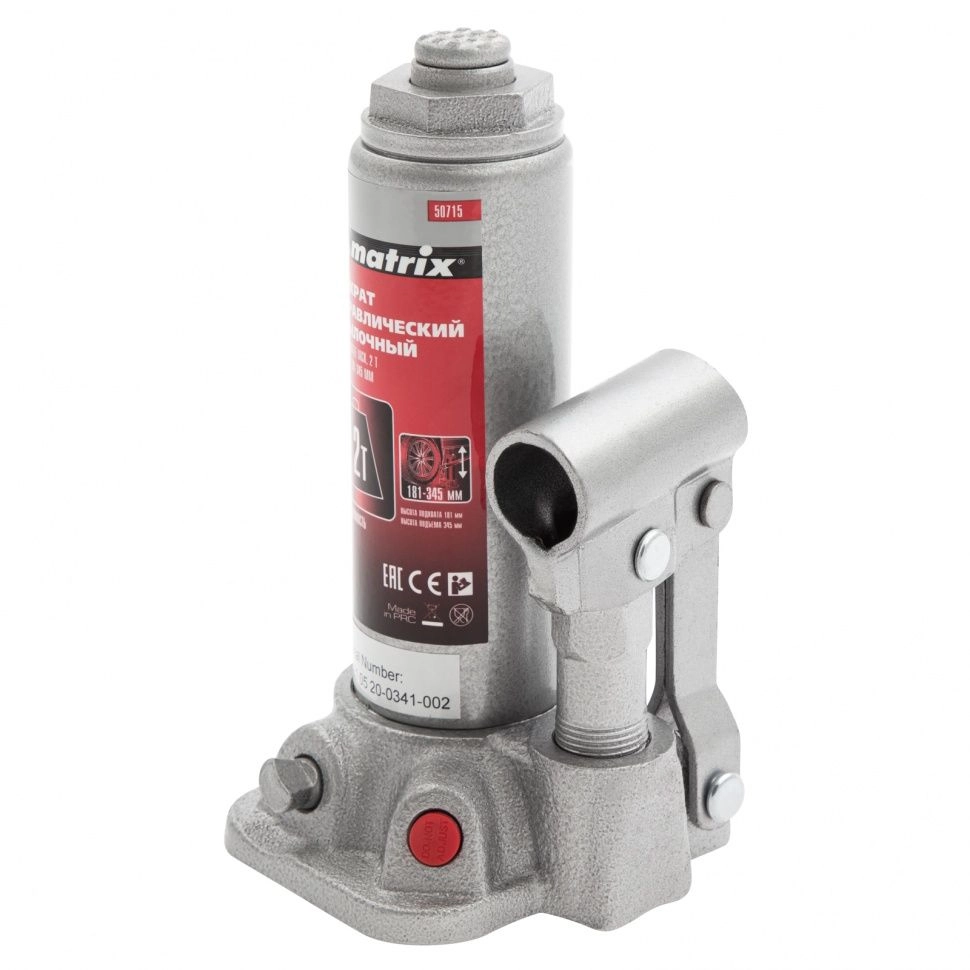 ПроизводителиДомкрат гидравлический бутылочный, 2т, h подъема 181–345мм (50715) MATRIX