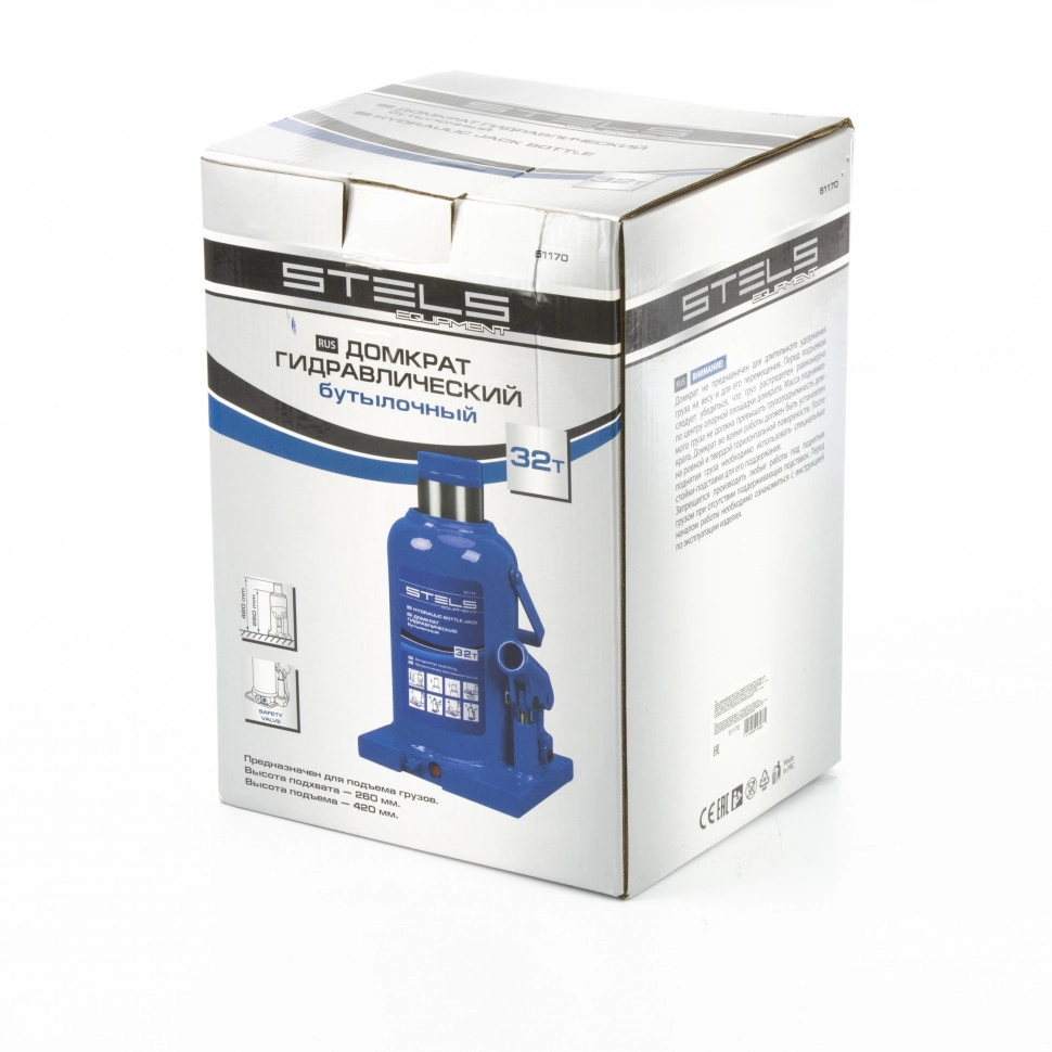 ПроизводителиДомкрат гидравлический бутылочный, 32т, h подъема 260–420мм (51170) STELS