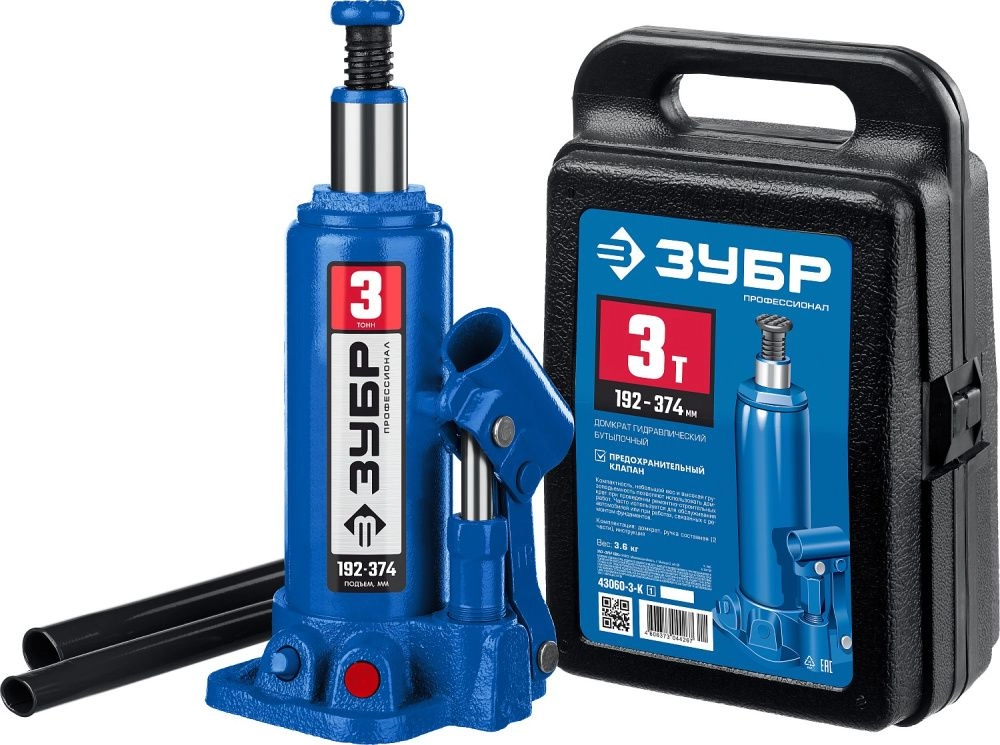 ПроизводителиДомкрат гидравлический бутылочный, 3т., 192-374 мм, в кейсе (43060-3-K_z01) ЗУБР