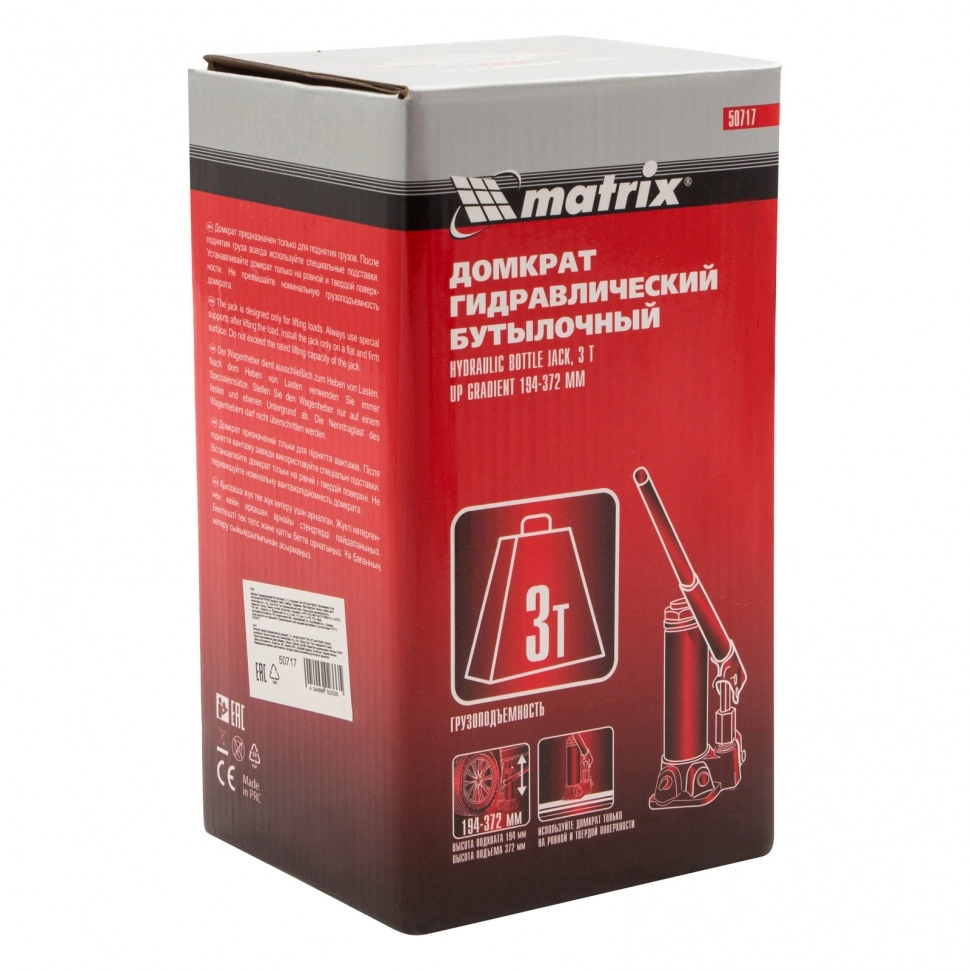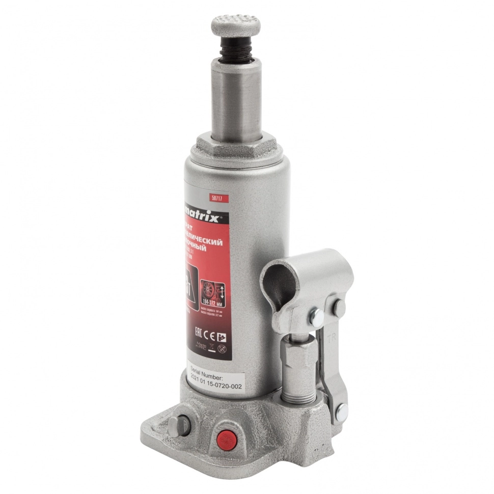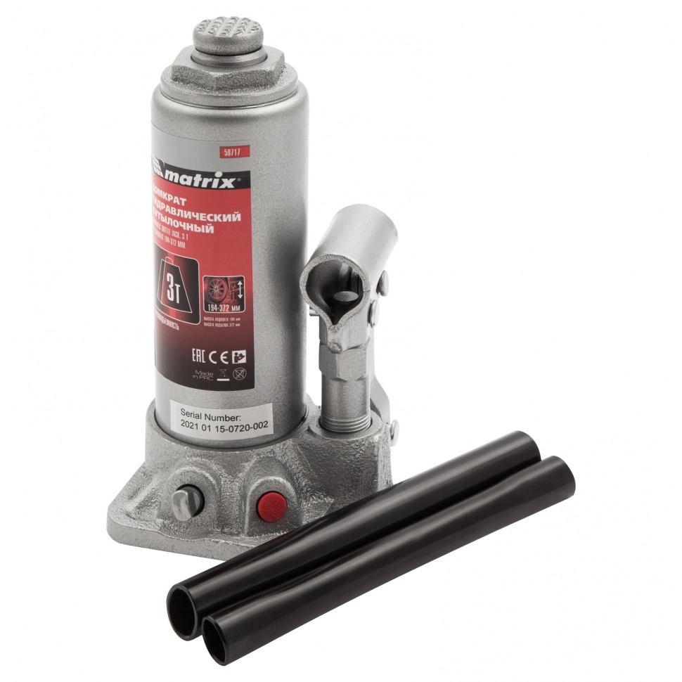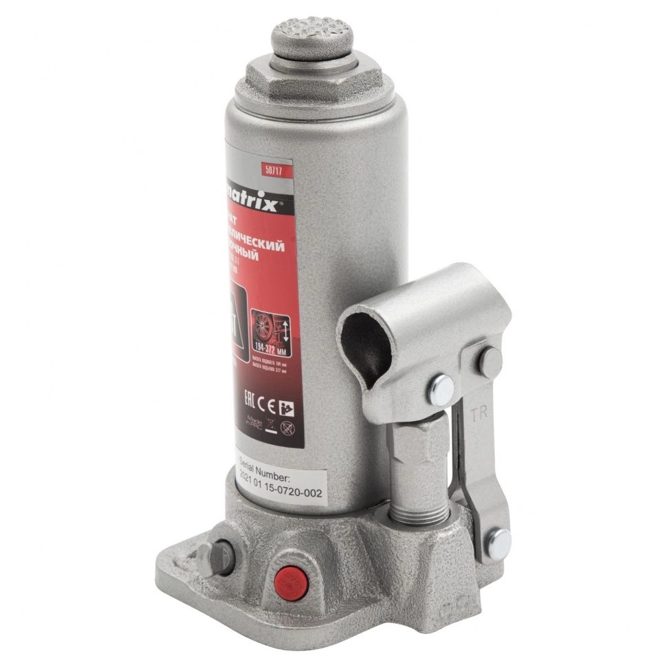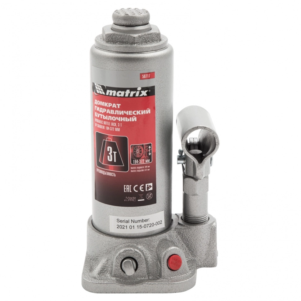 ПроизводителиДомкрат гидравлический бутылочный, 3т, h подъема 194–372мм (50717) MATRIX