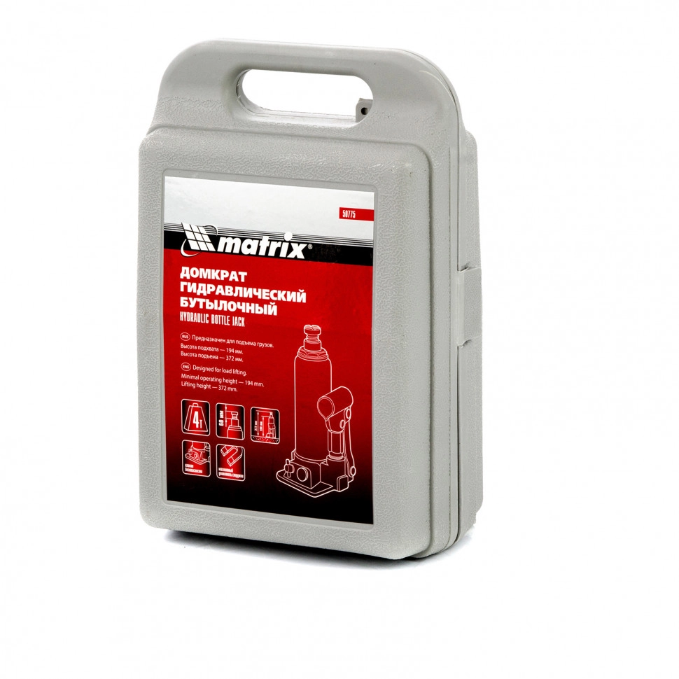 ПроизводителиДомкрат гидравлический бутылочный, 4т, h подъема 194–372мм, в пласт. кейсе (50775) MATRIX