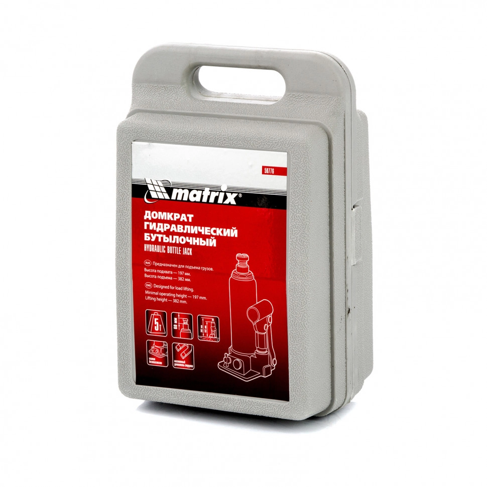 ПроизводителиДомкрат гидравлический бутылочный, 5т, h подъема 197–382мм, в пласт. кейсе (50776) MATRIX
