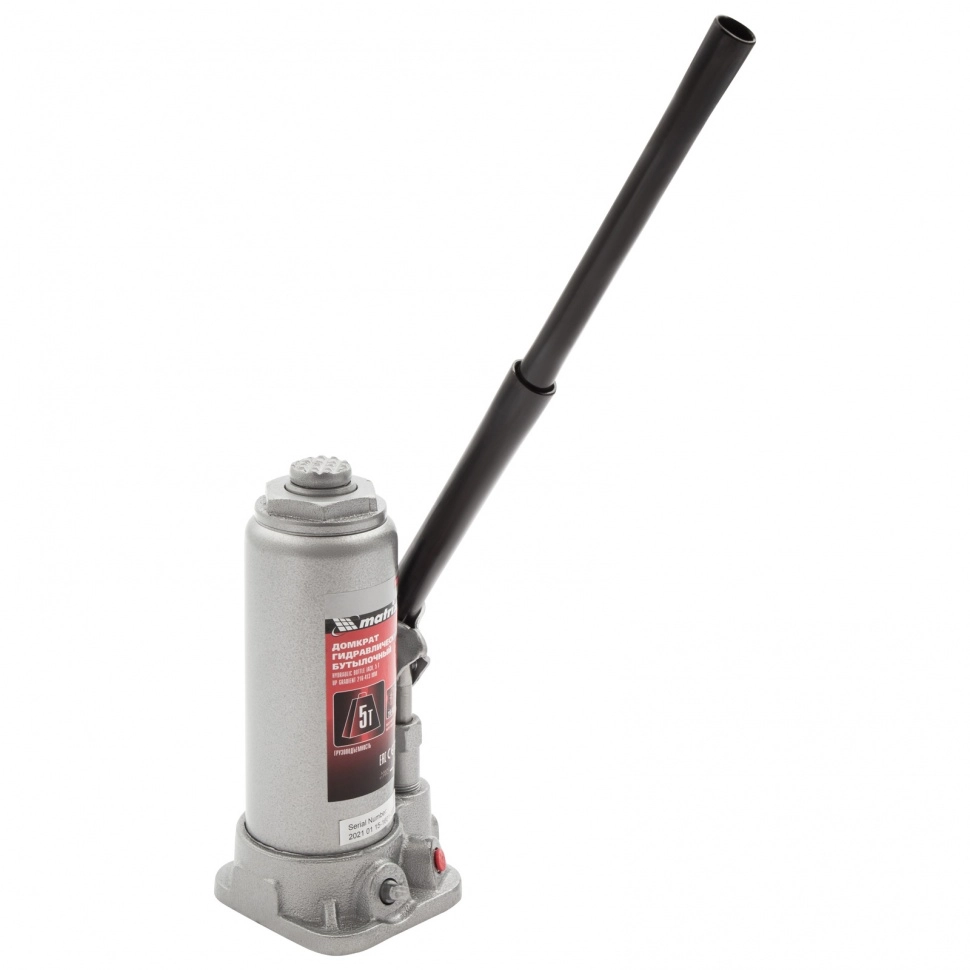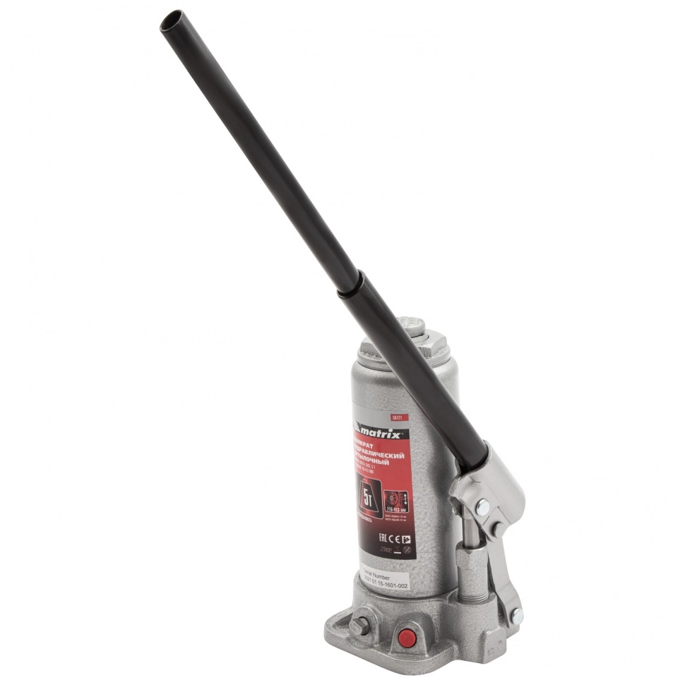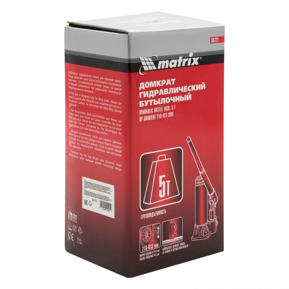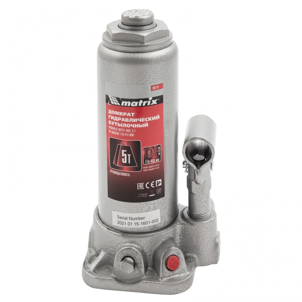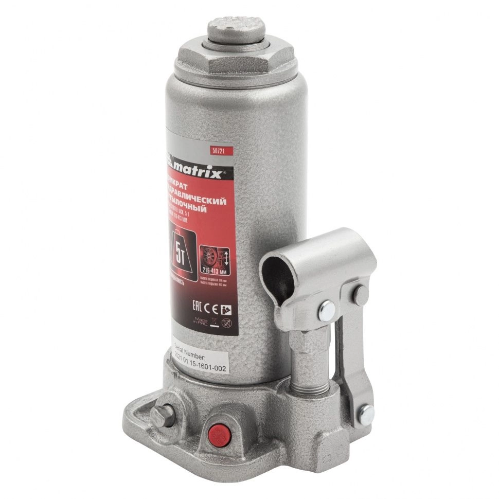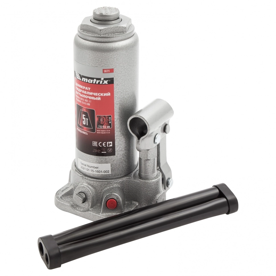 ПроизводителиДомкрат гидравлический бутылочный, 5т, h подъема 216–413мм (50721) MATRIX