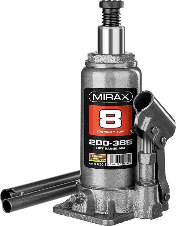 ПроизводителиДомкрат гидравлический бутылочный, 8т., 200-385 мм (43260-8) MIRAX