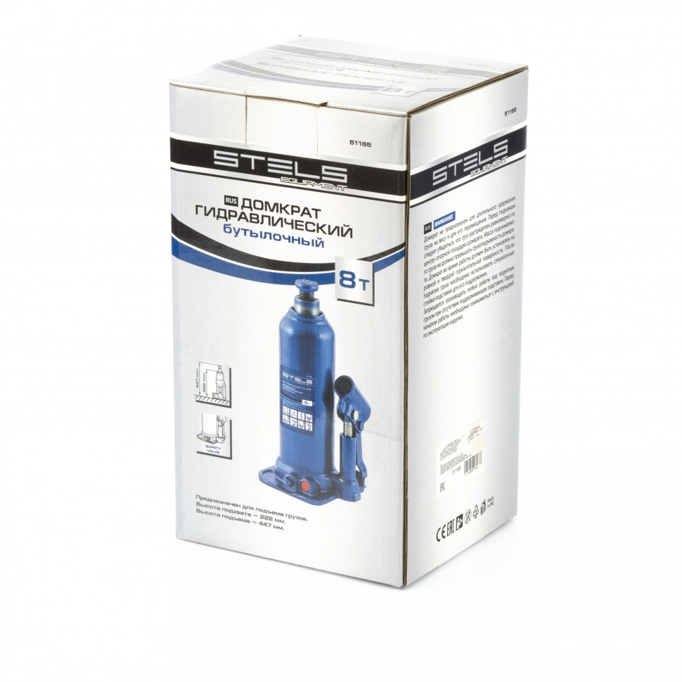 ПроизводителиДомкрат гидравлический бутылочный, 8т, h подъема 222-447мм (51165) STELS