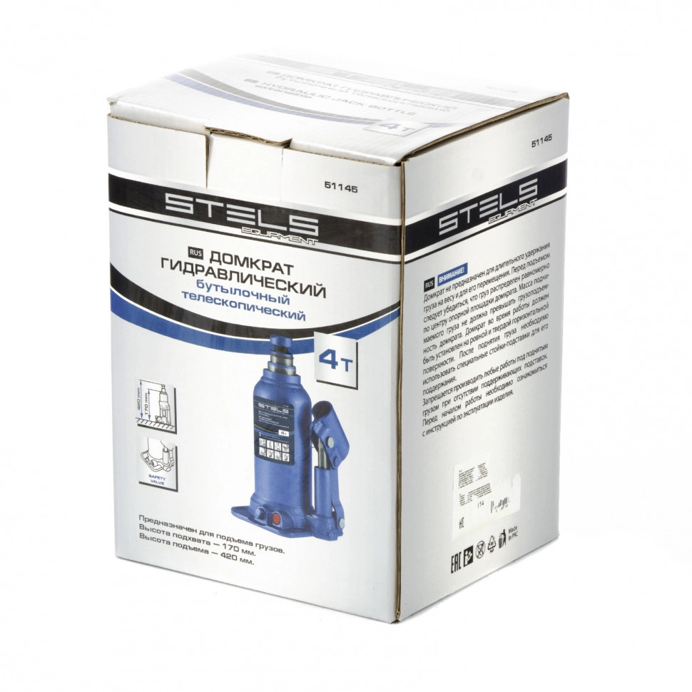 ПроизводителиДомкрат гидравлический бутылочный телескопический, 4т, подъем 170-420мм (51145) STELS