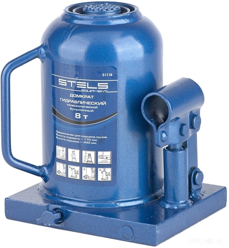 ПроизводителиДомкрат гидравлический бутылочный телескопический, 8т, h подъема 170–430мм (51118) STELS