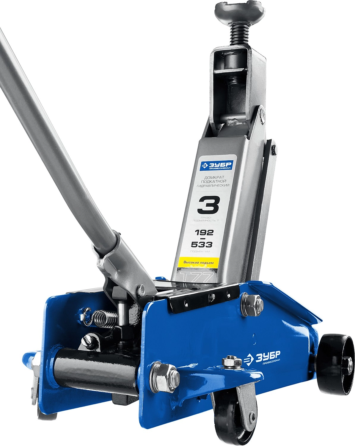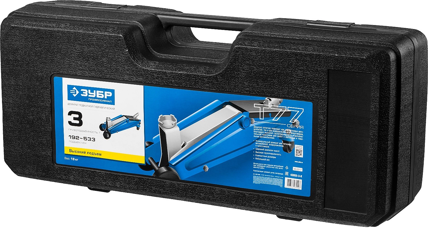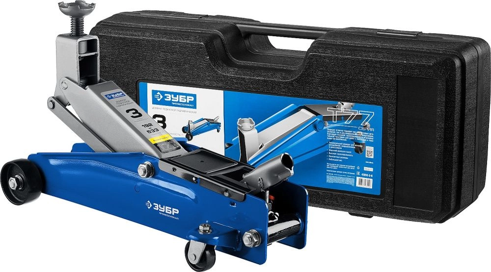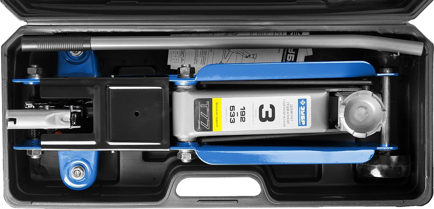 ПроизводителиДомкрат гидравлический подкатной, 3т., 192-533 мм, в кейсе, T77 "Профессионал" (43055-3-K) ЗУБР