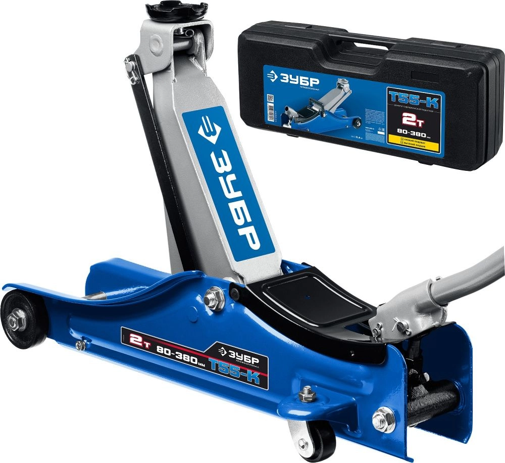 ПроизводителиДомкрат подкатной с увеличенным подъемом и низким подхватом 2т 80-380мм Т-55-K (43058-2-K) ЗУБР
