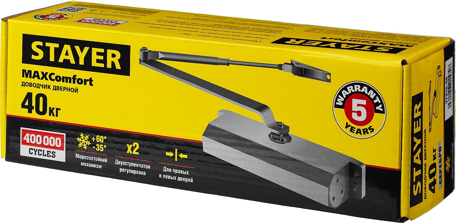ПроизводителиДоводчик дверной , для дверей массой до 40 кг, цвет серебро (37915-50) STAYER