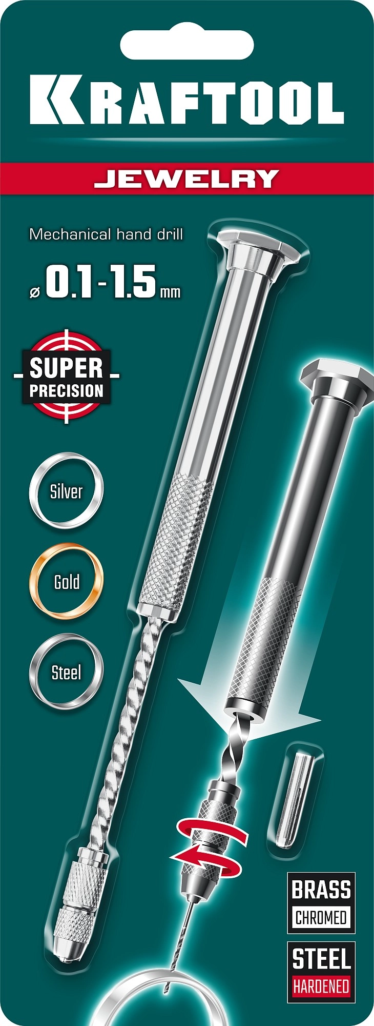 Профессиональная механическая ручная дрель KRAFTOOL Precision для особоточных ювелирных и электронных работ. Механизм вращения из закаленной стали. Корпус из хромированной латуни. Два стальных четырёхлепестковых зажима в комплекте. Для свёрл Ø 0,1-1,5 мм. Два полных оборота сверла за одно нажатие. Большой ресурс. Простота в использовании. Незаменимый помощник для работ требующих повышенной аккуратности.