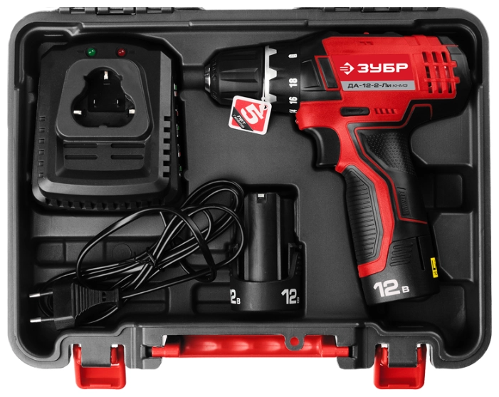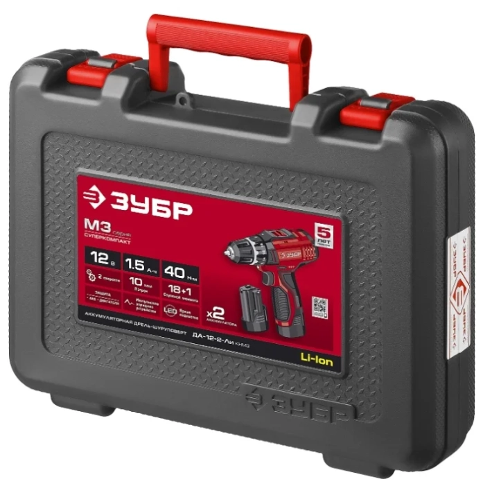 СТАНДАРТУровень качества. При классификации продуктов, имеющих схожее наименование, но обладающие различными потребительскими свойствами мы приняли следующий Вес факторов: 80% - подтвержденный ресурс, 15% - заявленная производительность/скорость, 5% - субъективные ощущения потребителя. ПодробнееКод товара: 0031581(0)Компактный и производительный инструмент - Ваш надежный помощник в работах по дому и в мастерской. Легкая, с оптимальной развесовкой и удобным хватом при больших мощности и крутящем моменте - дрель-шуруповерт ЗУБР способна справиться даже с самой серьезной работойХарактеристикиАртикул ДА-12-2-Ли КНМ3Бренды ЗубрСтрана производства КитайАккумуляторная система ЗУБР Li-Ion C1Тип дрель-шуруповертМакс. крутящий момент 40Мин. крутящий момент, Н/м 20Число оборотов холостого хода 1350Напряжение аккумулятора 12Макс. диаметр сверления, дерево 20Макс. диаметр сверления, металл 10Диаметр патрона 10Скорость вращения 1350Емкость аккумулятора 1.5Тип аккумулятора Li-ionКейс в комплекте естьРежимы работы шуруповертТормоз двигателя ДаВес 960Питание аккумуляторПатрон быстрозажимнойДополнительный аккумулятор естьРегулировка скорости вращения электроннаяРеверс естьКейс естьБлокировка кнопки включения естьСъемный аккумулятор ДаВремя зарядки 1Фиксация шпинделя ДаКоличество скоростей работы 2Описание товара обновлено 08.12.2025 14:07:33Компактный и производительный инструмент - Ваш надежный помощник в работах по дому и в мастерской. Легкая, с оптимальной развесовкой и удобным хватом при больших мощности и крутящем моменте - дрель-шуруповерт ЗУБР способна справиться даже с самой серьезной работой