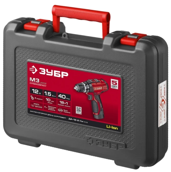 СТАНДАРТУровень качества. При классификации продуктов, имеющих схожее наименование, но обладающие различными потребительскими свойствами мы приняли следующий Вес факторов: 80% - подтвержденный ресурс, 15% - заявленная производительность/скорость, 5% - субъективные ощущения потребителя. ПодробнееКод товара: 0031580(0)Компактный и производительный инструмент - Ваш надежный помощник в сверлении отверстий в различных материалах и вкручивании/выкручивании крепежа. Легкая, с оптимальной развесовкой и удобным хватом при больших мощности и крутящем моменте - дрель-шуруповерт ЗУБР способна справиться даже с самой серьезной работойХарактеристикиАртикул ДА-12-2-Ли КМ3Бренды ЗубрСтрана производства КитайАккумуляторная система ЗУБР Li-Ion C1Тип дрель-шуруповертМакс. крутящий момент 40Мин. крутящий момент, Н/м 20Число оборотов холостого хода 1350Напряжение аккумулятора 12Макс. диаметр сверления, дерево 20Макс. диаметр сверления, металл 10Диаметр патрона 10Скорость вращения 1350Емкость аккумулятора 1.5Тип аккумулятора Li-ionКейс в комплекте естьРежимы работы сверлениеТормоз двигателя ДаВес 960Питание аккумуляторПатрон быстрозажимнойРегулировка скорости вращения электроннаяРеверс естьКейс естьБлокировка кнопки включения естьСъемный аккумулятор ДаВремя зарядки 1Фиксация шпинделя ДаКоличество скоростей работы 2Описание товара обновлено 08.12.2025 14:07:26Компактный и производительный инструмент - Ваш надежный помощник в сверлении отверстий в различных материалах и вкручивании/выкручивании крепежа. Легкая, с оптимальной развесовкой и удобным хватом при больших мощности и крутящем моменте - дрель-шуруповерт ЗУБР способна справиться даже с самой серьезной работой