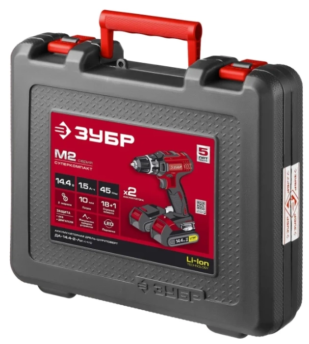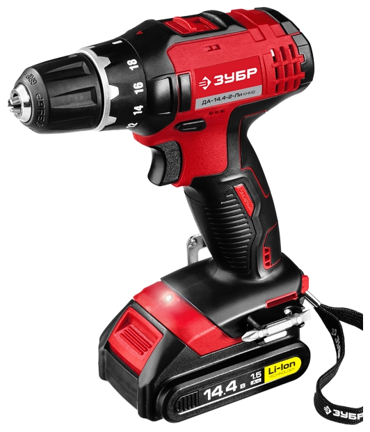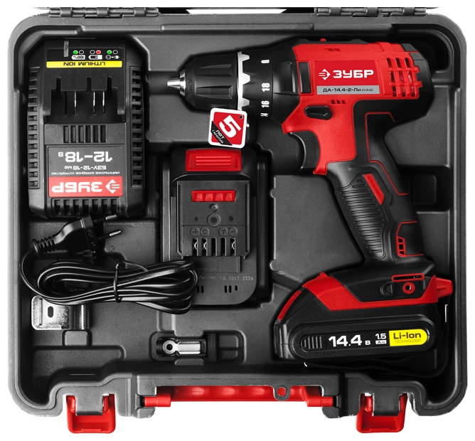 СТАНДАРТУровень качества. При классификации продуктов, имеющих схожее наименование, но обладающие различными потребительскими свойствами мы приняли следующий Вес факторов: 80% - подтвержденный ресурс, 15% - заявленная производительность/скорость, 5% - субъективные ощущения потребителя. ПодробнееКод товара: 0031582(0)Компактный шуруповерт в линейке инструментов ЗУБР - это новый уровень удобства и производительности работы. Мощный двигатель, две емкие батареи и подсветка - все для лучшего результатаХарактеристикиАртикул ДА-14.4-2-Ли КНМ2Бренды ЗубрСтрана производства КитайАккумуляторная система ЗУБР Li-Ion C1Тип дрель-шуруповертМакс. крутящий момент 45Мин. крутящий момент, Н/м 22Число оборотов холостого хода 350Напряжение аккумулятора 14.4Макс. диаметр сверления, дерево 25Макс. диаметр сверления, металл 10Диаметр патрона 10Скорость вращения 1350Емкость аккумулятора 1.5Тип аккумулятора Li-ionКейс в комплекте естьРежимы работы шуруповертТормоз двигателя ДаВес 1100Питание аккумуляторПатрон быстрозажимнойДополнительный аккумулятор естьРегулировка скорости вращения электроннаяРеверс естьКейс естьБлокировка кнопки включения естьСъемный аккумулятор ДаВремя зарядки 1Фиксация шпинделя ДаКоличество скоростей работы 2Описание товара обновлено 08.12.2025 14:07:48Компактный шуруповерт в линейке инструментов ЗУБР - это новый уровень удобства и производительности работы. Мощный двигатель, две емкие батареи и подсветка - все для лучшего результата