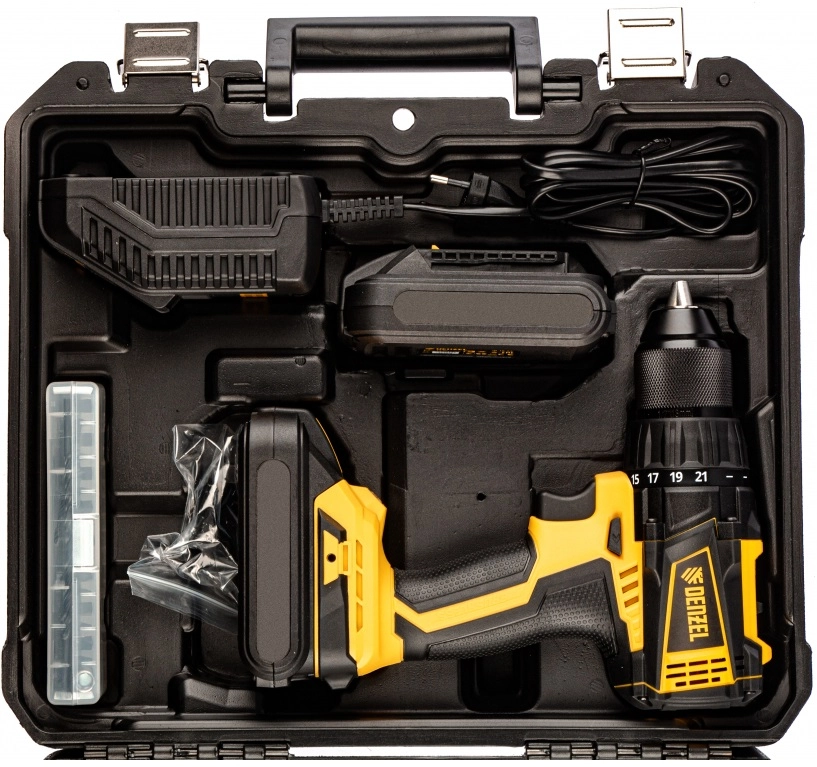 ПРОФИУровень качества. При классификации продуктов, имеющих схожее наименование, но обладающие различными потребительскими свойствами мы приняли следующий Вес факторов: 80% - подтвержденный ресурс, 15% - заявленная производительность/скорость, 5% - субъективные ощущения потребителя. ПодробнееКод товара: 0080652(0)ХарактеристикиАртикул 26141Бренды DENZELСтрана производства КитайТип дрель-шуруповертМакс. крутящий момент 65Напряжение аккумулятора 18Макс. диаметр сверления, дерево 25Макс. диаметр сверления, металл 13Диаметр патрона 13Скорость вращения 2000Емкость аккумулятора 1.5Режимы работы сверлениеТормоз двигателя ДаАккумулятор в комплекте ДаВес 3350Питание аккумуляторПатрон быстрозажимнойРеверс естьКейс естьПодсветка естьИндикатор уровня заряда аккумулятора естьКоличество аккумуляторов в комплекте 2Фиксация шпинделя ДаКоличество бит в комплекте 6Количество свёрл в комплекте 6Описание товара обновлено 08.12.2025 15:34:41Аккумуляторная дрель-шуруповерт Denzel BLDL-18-0 26141 с бесщеточным двигателем предназначена для сверления отверстий, закручивания и откручивания резьбового крепежа. Максимальный диаметр отверстий в древесине составляет 25 мм, в металле — 13 мм. Величина крутящего момента достигает 50 Н·м, что позволяет эффективно решать поставленные задачи.
