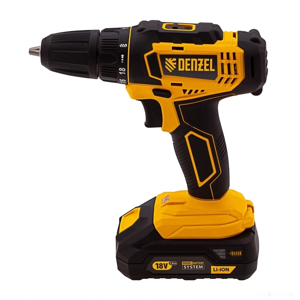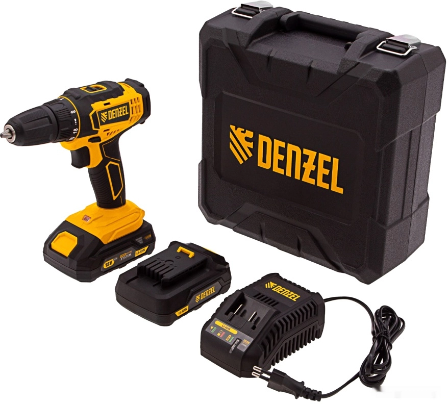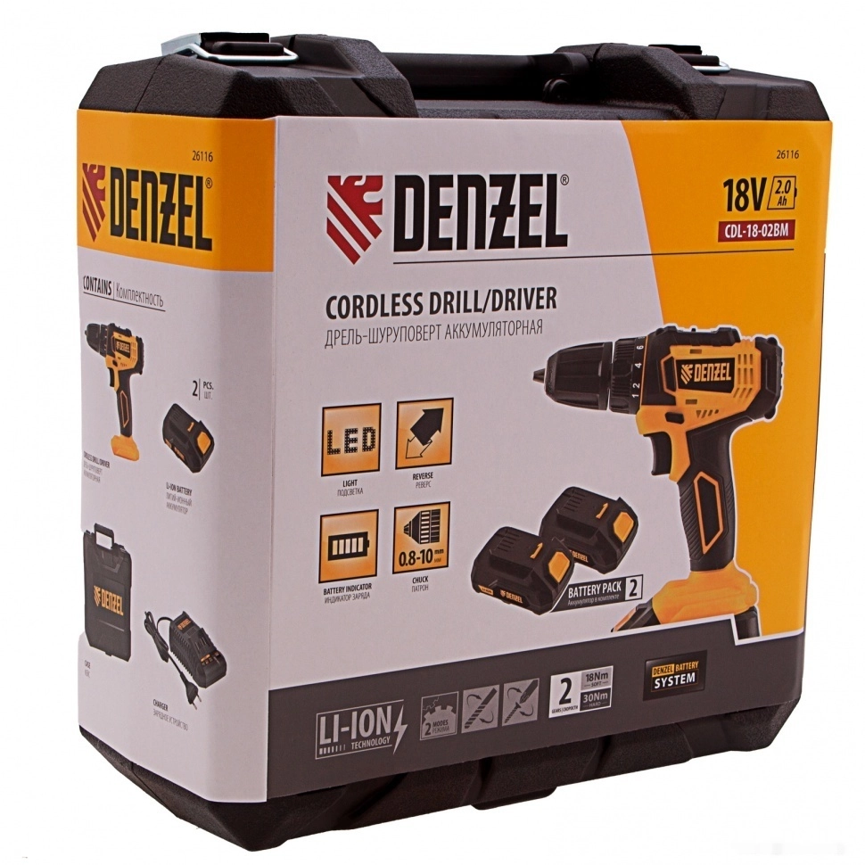 Бренд: DENZELАккумуляторная дрель-шуруповерт Denzel CDL-18-02BM 26116 с Li-Ion аккумуляторами 18 В предназначена для ввинчивания и вывинчивания винтов и шурупов, а также получения отверстий в различных конструкционных материалах: металле, древесине, пластмассе и т.п. Оптимальна для интенсивного использования как в быту, так и на строительных объектах, пригодится в процессе ремонта, при сборке мебели и т.д. Система защиты от перегрузки, перегрева, глубокой разрядки и нежелательного перезаряда обеспечивает долговечность инструмента и комфортную работу.