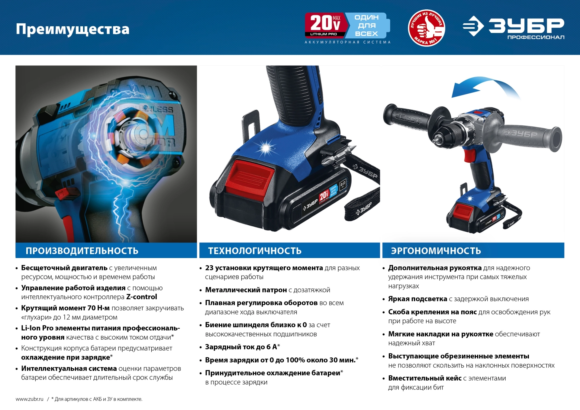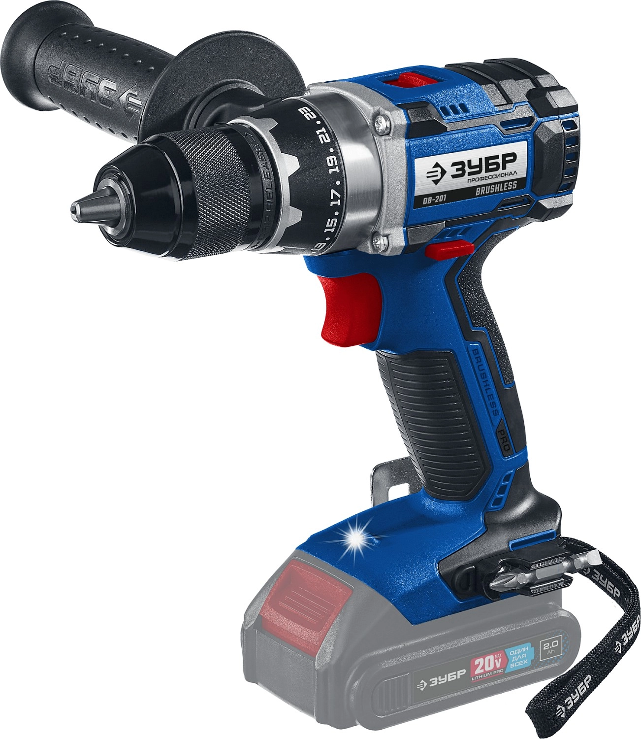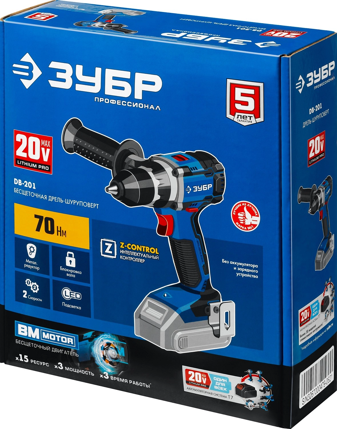 ХарактеристикиАртикул DB-201Бренды ЗубрСтрана производства КитайАккумуляторная система ЗУБР Li-Ion PRO 20BТип дрель-шуруповертТип патрона быстрозажимнойКоличество скоростей 2Макс. крутящий момент 70Мин. крутящий момент, Н/м 35Число оборотов холостого хода 1800Напряжение аккумулятора 20Макс. диаметр сверления, дерево 45Макс. диаметр сверления, металл 13Скорость вращения 1800Емкость аккумулятора 2Тип аккумулятора Li-IonКейс в комплекте нетБыстросменный патрон НетАккумулятор в комплекте НетВес 1400Питание аккумуляторКрутящий момент 70Кейс НетДлина 195Блокировка шпинделя естьВысота 215Реверс естьMax диаметр сверления древесины 45Подсветка естьMax диаметр сверления стали 13Бесщеточный двигатель ДаМин. Диаметр патрона 1.5Макс. Диаметр патрона 13Способ крепления аккумулятора слайдерСкорость вращения на первой скорости 500Фиксация кнопки включения НетРегулировка крутящего момента 24Регулировка оборотов ДаОписание товара обновлено 08.12.2025 14:17:52Аккумуляторная дрель шуруповерт ЗУБР DB-201, предназначена для сверления отверстий в различных материалах (при установке сверла), а также для вкручивания/выкручивания шурупов, саморезов и винтов (при установке соответствующих бит). Бесщеточный двигатель Brushless обладает целым рядом преимуществ по сравнению с обычным щеточным двигателем: высокий крутящий момент в 2 раза выше, чем у аналогичного щеточного двигателя; высокий КПД благодаря максимально эффективному преобразованию электромагнитной энергии в механическую (ввиду отсутствия перекоммутаций), низкое энергопотребление, вследствие чего изделие работает до 4 раз дольше на одном заряде батареи, высокая степень защиты двигателя благодаря интеллектуальному управлению. Быстрозажимной одномуфтовый металлический патрон для максимальной простоты и скорости замены расходного инструмента, электронный тормоз двигателя для исключения выбега при остановке.