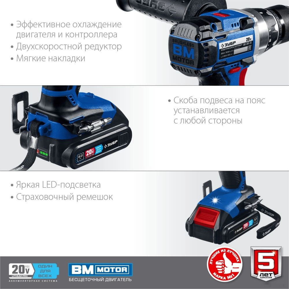 ПРОФИУровень качества. При классификации продуктов, имеющих схожее наименование, но обладающие различными потребительскими свойствами мы приняли следующий Вес факторов: 80% - подтвержденный ресурс, 15% - заявленная производительность/скорость, 5% - субъективные ощущения потребителя. ПодробнееКод товара: 0055500(5)Высокотехнологичный шуруповерт профессионального уровня с передовым BRUSHLESS двигателем. Высокий крутящий момент 70 Нм, надежность конструкции и отличная эргономика позволяют выполнять практически любую работу - сверление дерева сверлом Левиса, сверление металла ступенчатым сверлом, заворачивание крепежа диаметром до 12 мм, перемешивание ЛКМ и прочее без усилий с Вашей стороны и перегрузки инструмента. Комплектация с двумя батареями и быстрозарядным устройством позволяет начать работу сразу после покупкиХарактеристикиАртикул DB-201-22Бренды ЗубрСтрана производства КитайАккумуляторная система ЗУБР Li-Ion PRO 20BТип дрель-шуруповертТип патрона быстрозажимнойКоличество скоростей 2Макс. крутящий момент 75Мин. крутящий момент, Н/м 30Число оборотов холостого хода 1800Напряжение аккумулятора 20Макс. диаметр сверления, дерево 45Макс. диаметр сверления, металл 13Скорость вращения 1800Емкость аккумулятора 2Время зарядки 30Индикация заряда батареи ДаТип аккумулятора Li-IonКейс в комплекте естьБыстросменный патрон НетАккумулятор в комплекте ДаВес 1700Питание аккумуляторКрутящий момент 70Кейс ДаДлина 195Блокировка шпинделя естьВысота 215Реверс естьMax диаметр сверления древесины 45Подсветка естьMax диаметр сверления стали 13Бесщеточный двигатель ДаМин. Диаметр патрона 1.5Время зарядки 30Макс. Диаметр патрона 13Способ крепления аккумулятора слайдерСкорость вращения на первой скорости 500Фиксация кнопки включения НетРегулировка крутящего момента 24Регулировка оборотов ДаОписание товара обновлено 28.01.2026 17:01:56Аккумуляторная дрель шуруповерт ЗУБР DB-201-22, предназначена для сверления отверстий в различных материалах (при установке сверла), а также для вкручивания/выкручивания шурупов, саморезов и винтов (при установке соответствующих бит). Двигатель Brushless обладает целым рядом преимуществ по сравнению с обычным щеточным двигателем: высокий крутящий момент – в 2 раза выше, чем у аналогичного щеточного двигателя; - высокий КПД благодаря максимально эффективному преобразованию электромагнитной энергии в механическую (ввиду отсутствия перекоммутаций), низкое энергопотребление, вследствие чего изделие работает до 4 раз дольше на одном заряде батареи; высокая степень защиты двигателя благодаря интеллектуальному управлению; контроллер двигателя позволяет гибко регулировать крутящий момент и поддерживать его на максимальном уровне в широком диапазоне оборотов. Имеется 2 батареи в комплекте для безостановочной работы.Производитель: Крафтул И/Е Гмбх, Альтер Поствег Штр., Лоенинген, Германия