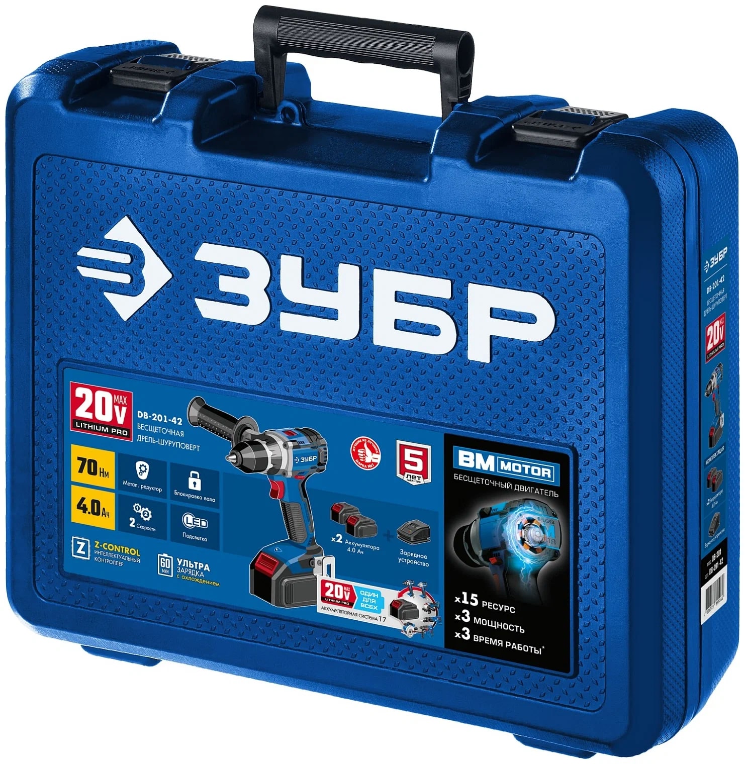 ПроизводителиДрель-шуруповерт аккум. DB-201-42 (20.0 В, 2акк. х 4.0 А/ч Li-Ion, 70 Нм, чем.) "Профессионал" ЗУБР