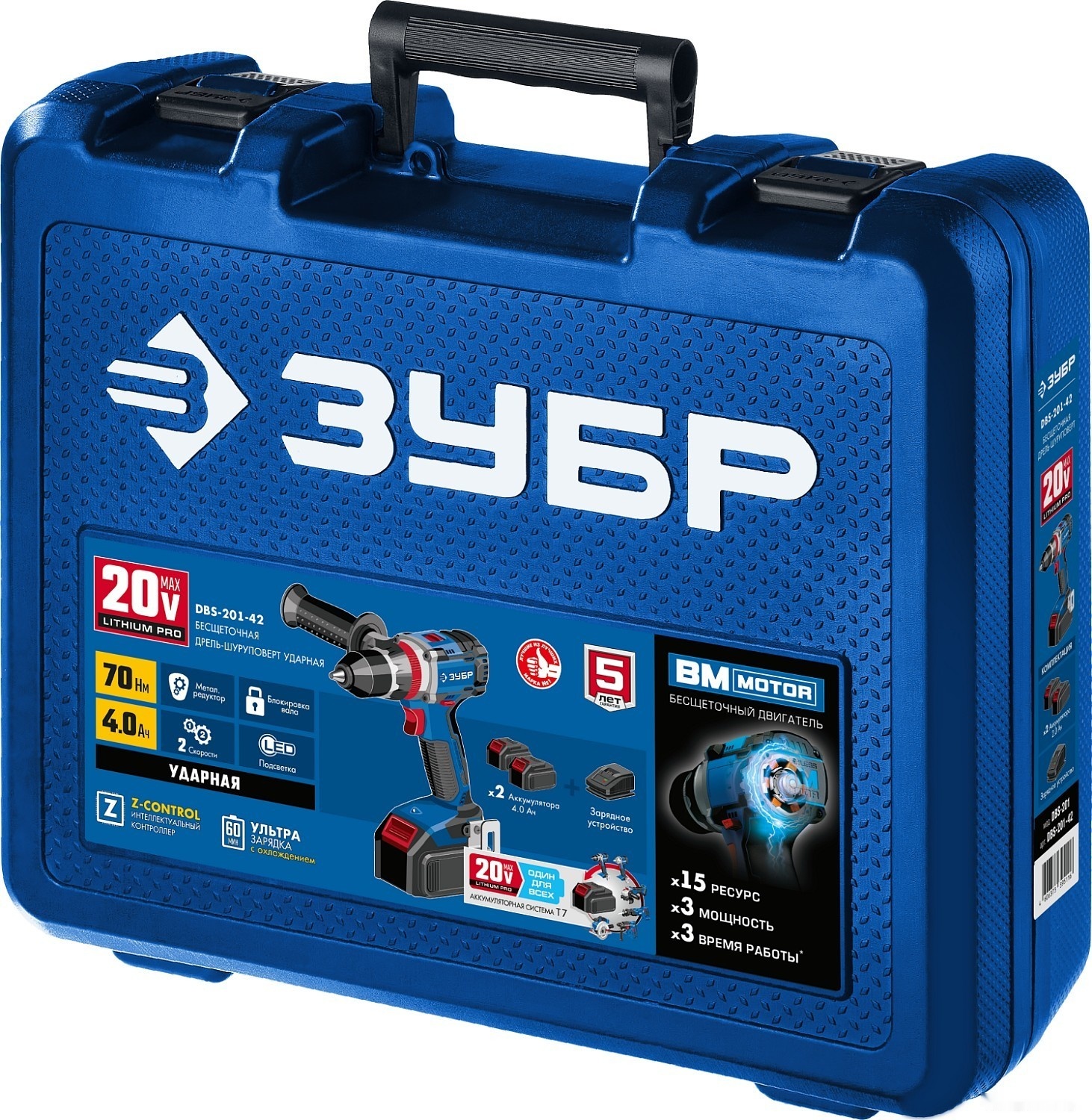 ПроизводителиДрель-шуруповерт ударная аккум. DBS-201-42 (20.0 В, 2акк. х 4.0 А/ч Li-Ion, 70 Нм,чем.) "Проф." ЗУБР