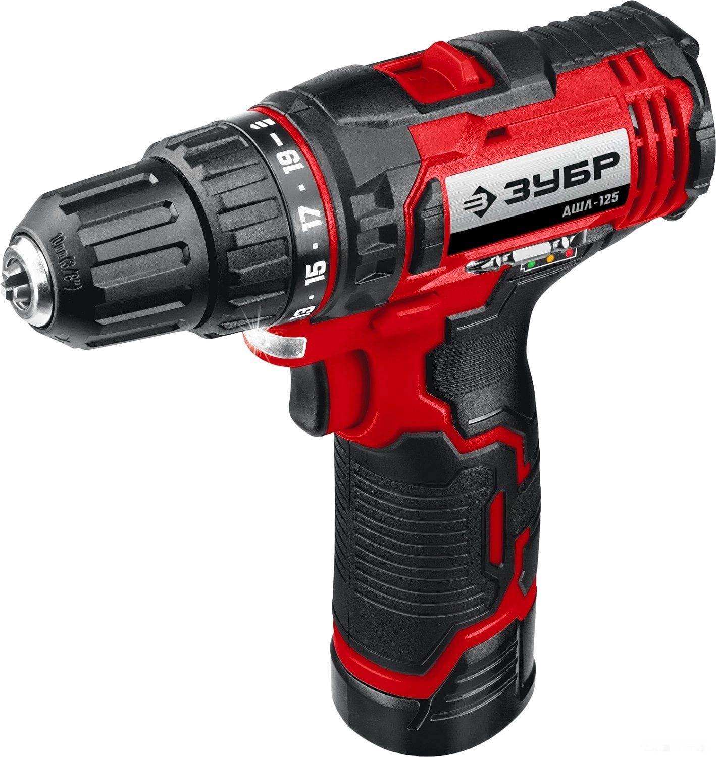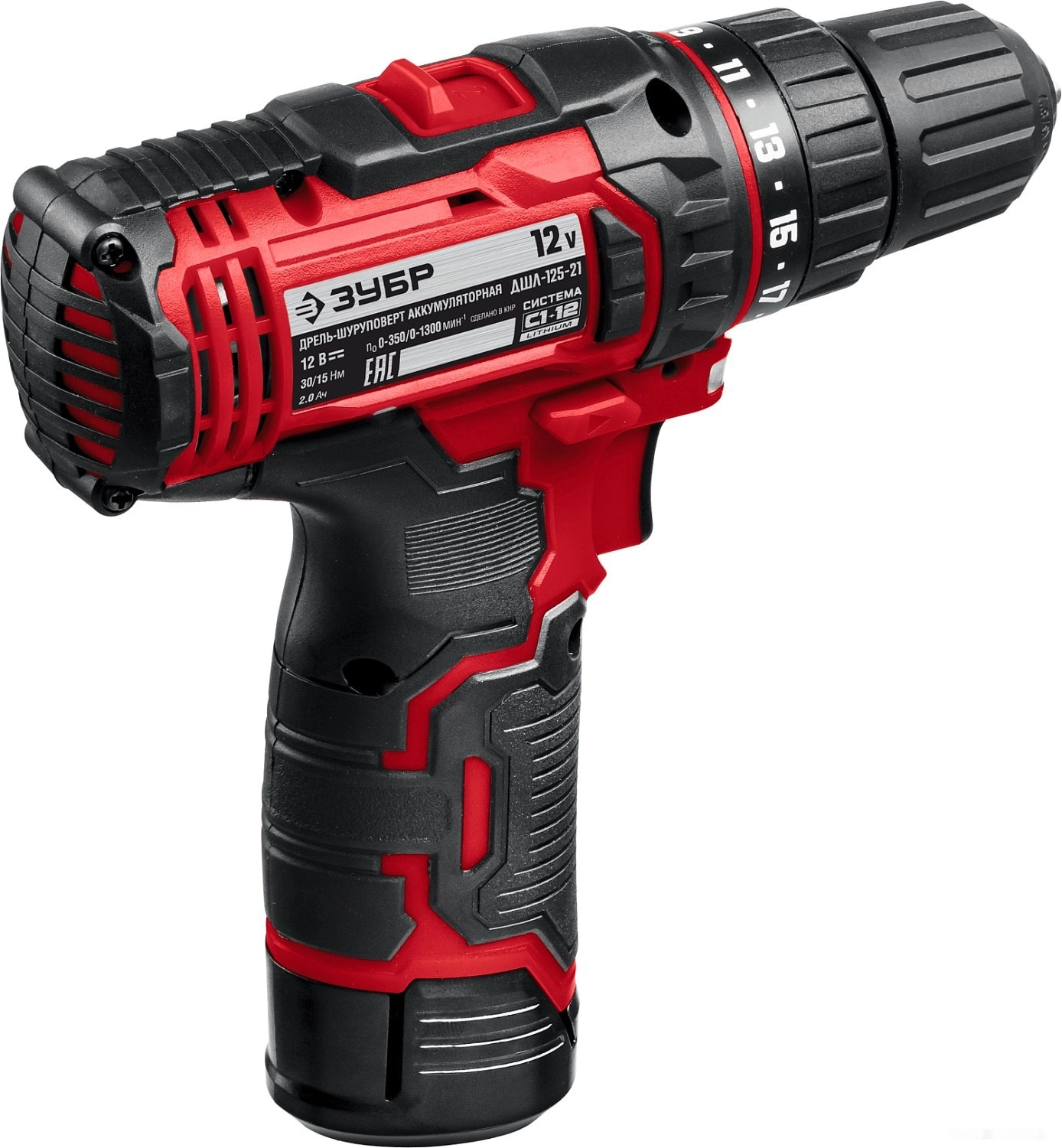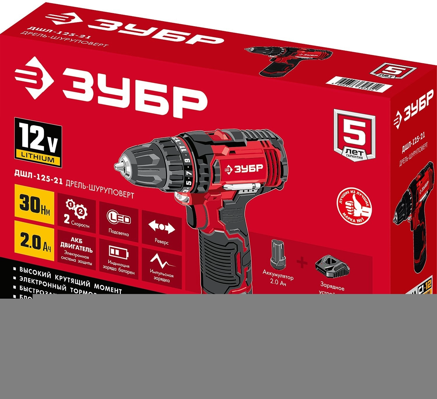 ХарактеристикиАртикул ДШЛ-125-21Бренды ЗубрСтрана производства КитайАккумуляторная система ЗУБР Li-Ion C1 12ВТип дрель-шуруповертТип патрона быстрозажимнойКоличество скоростей 2Макс. крутящий момент 25Мин. крутящий момент, Н/м 15Число оборотов холостого хода 1300Напряжение аккумулятора 12Макс. диаметр сверления, дерево 21Макс. диаметр сверления, металл 10Скорость вращения 1300Емкость аккумулятора 2Индикация заряда батареи ДаТип аккумулятора Li-IonКейс в комплекте нетБыстросменный патрон НетАккумулятор в комплекте ДаВес 1100Питание аккумуляторКрутящий момент 30Длина 275Ширина 82Блокировка шпинделя естьВысота 242Реверс естьMax диаметр сверления древесины 21Подсветка естьMax диаметр сверления стали 10Бесщеточный двигатель НетМин. Диаметр патрона 0.8Макс. Диаметр патрона 10Способ крепления аккумулятора обоймаФиксация кнопки включения НетРегулировка крутящего момента 20Регулировка оборотов ДаОписание товара обновлено 08.12.2025 14:17:15Аккумуляторная дрель шуруповерт ЗУБР ДШЛ-125-21, предназначена для сверления отверстий в различных материалах (при установке сверла), а также для вкручивания/выкручивания шурупов, саморезов и винтов (при установке соответствующих бит). Высокий крутящий момент при широком диапазоне оборотов благодаря конструкции редуктора. Бесключевой одномуфтовый патрон для максимальной простоты и скорости замены расходного инструмента. Двухскоростной планетарный редуктор позволяет, как заворачивать с большим крутящим моментом, так и сверлить на высоких оборотах. Многофункциональный выключатель с электроникой обеспечивает: контроль и защиту батареи от глубокого разряда, перегрузки и перегрева (не требует дополнительной микросхемы в батарее); управление всеми режимами работы двигателя (старт, регулировка скорости, торможение, реверс); управление подсветкой. Встроенный в корпус магнитный держатель для бит позволяет всегда иметь их под рукой.