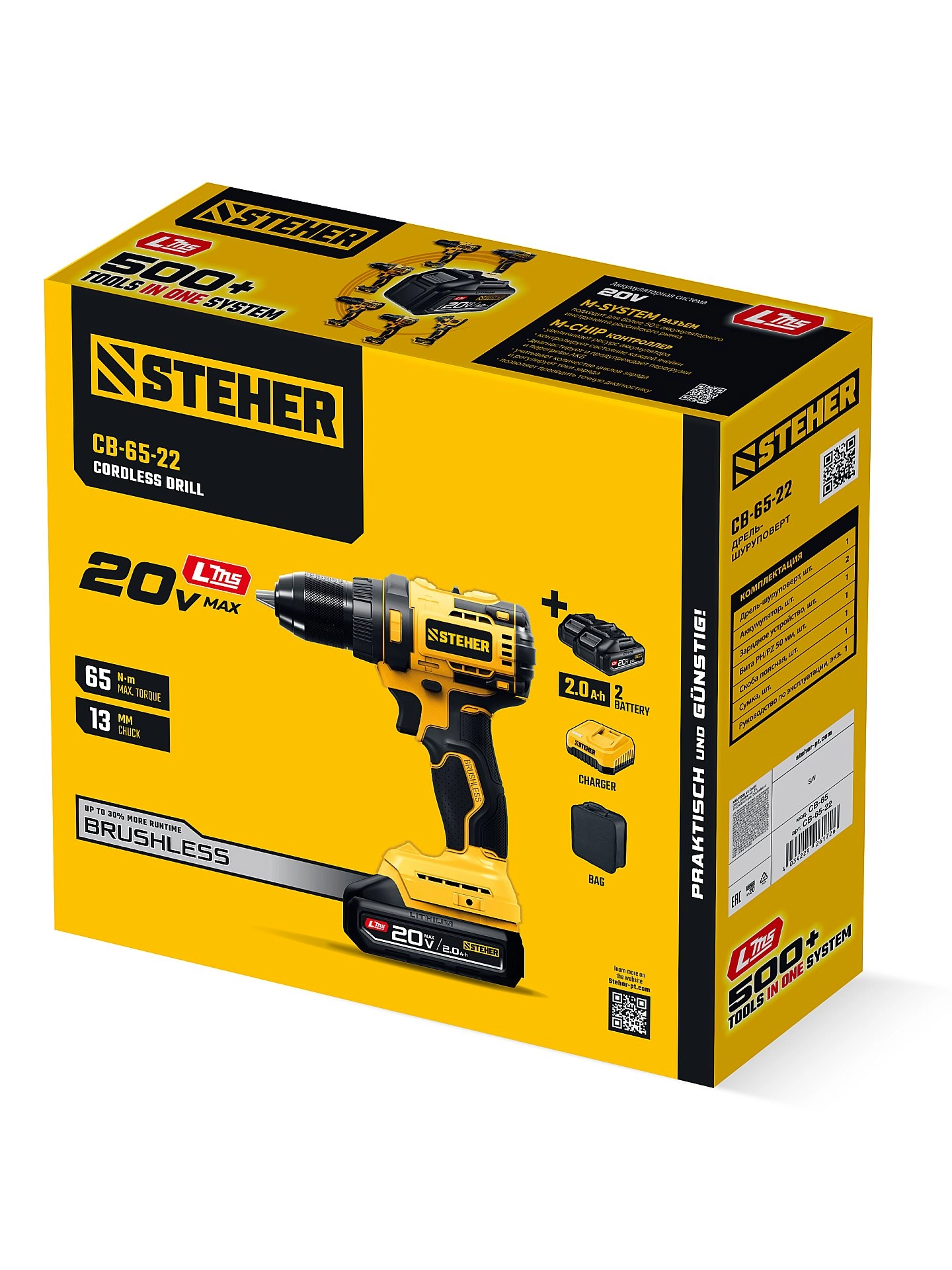 Дрель-шуруповерт бесщеточная 20 В, 65Нм, 2 АКБ LMS 2Ач, сумка(CB-65-22) STEHER