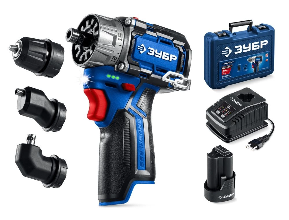 ПроизводителиДрель-шуруповерт модульная,кейс,12В, 45Нм, 1 АКБ тип Т7 2 А·ч,КОМБИ#2.BRUSHLESS,Проф(DB-125-21) ЗУБР