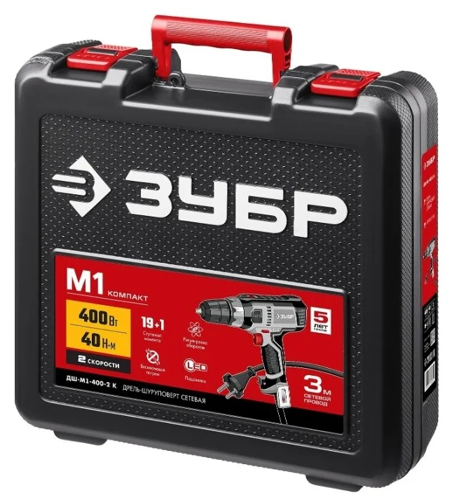 СТАНДАРТУровень качества. При классификации продуктов, имеющих схожее наименование, но обладающие различными потребительскими свойствами мы приняли следующий Вес факторов: 80% - подтвержденный ресурс, 15% - заявленная производительность/скорость, 5% - субъективные ощущения потребителя. ПодробнееКод товара: 0044251(1)ХарактеристикиАртикул ДШ-М1-400-2 КБренды ЗубрСтрана производства КитайТип дрель-шуруповертТип патрона быстрозажимнойПотребляемая мощность 400Количество скоростей 2Макс. крутящий момент 40Число оборотов холостого хода 1800Макс. диаметр сверления, дерево 28Макс. диаметр сверления, металл 10Скорость вращения 1800Длина сетевого шнура 3Кейс в комплекте естьБыстросменный патрон НетВес 1300Питание сетьМаксимальный диаметр шурупов 8Крутящий момент 40Кейс ДаДлина 270Ширина 85Блокировка шпинделя нетВысота 265Длина кабеля 3Реверс естьОграничительная муфта ДаMax диаметр сверления древесины 25Подсветка естьMax диаметр сверления стали 10Бесщеточный двигатель НетМин. Диаметр патрона 0.8Макс. Диаметр патрона 10Фиксация кнопки включения НетРегулировка крутящего момента 20Регулировка оборотов ДаОписание товара обновлено 08.12.2025 14:16:54Описание дрель шуруповерта ЗУБР ДШ-М1-400-2